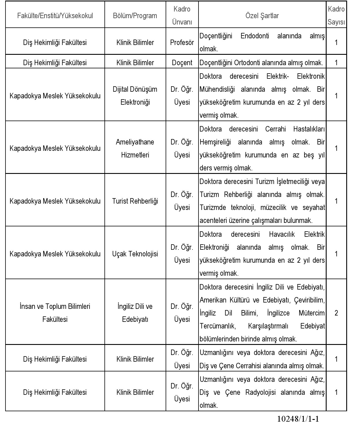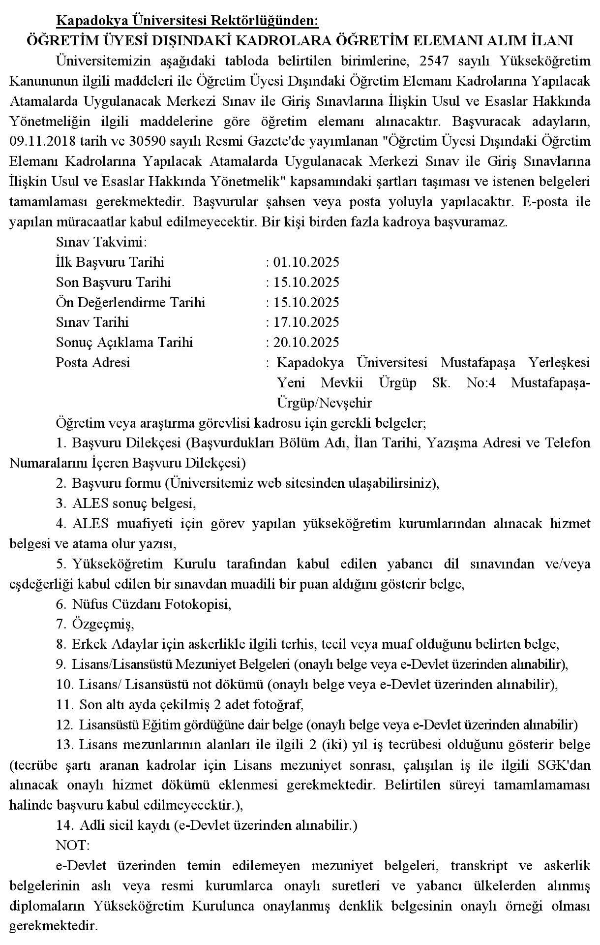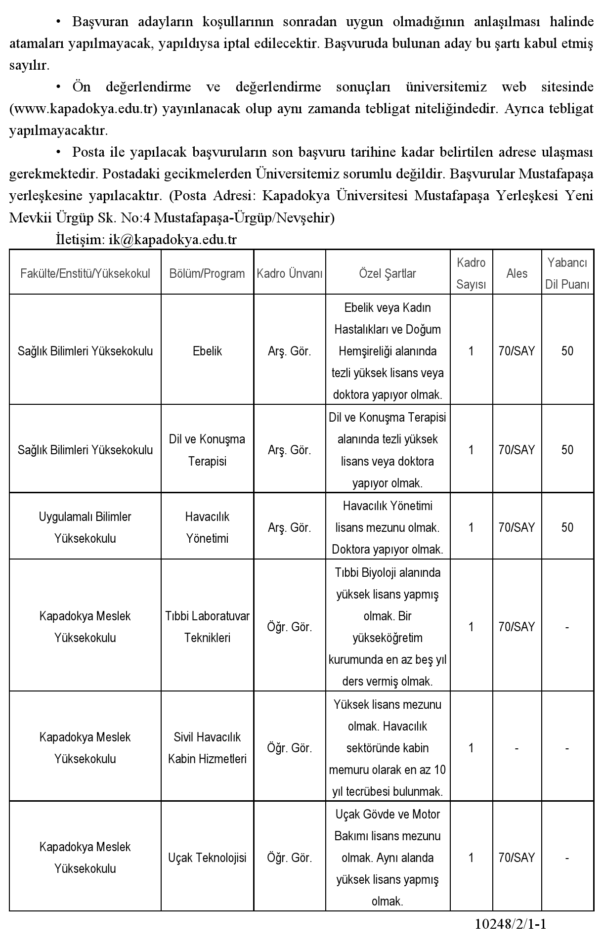Üniversitemizin çeşitli bölümlerinde görev yapmak üzere 2547 sayılı Yükseköğretim Kanunu, Öğretim Üyeliğine Yükseltilme ve Atanma Yönetmeliği ile Vakıf Yüksek Öğretim Kurumları Yönetmeliği'nin ilgili maddeleri uyarınca aşağıda nitelikleri belirtilen kadrolara öğretim üyeleri alınacaktır. Başvuracak adayların ilgili yönetmelik hükümlerine göre asgari başvuru koşullarını sağlamış olmak şartıyla üniversitemiz web sitesinde belirtilen evrakları süresi içerisinde Kapadokya Üniversitesi Mustafapaşa Yerleşkesi Yeni Mevkii Ürgüp Sk. No:4 Mustafapaşa-Ürgüp/Nevşehir'de bulunan Üniversitemiz rektörlüğüne teslim etmeleri gerekmektedir. Başvuru dosyasında eksik belge olması halinde, adayın başvurusu değerlendirmeye alınmayacaktır. Kişi bundan doğan bir hak iddia edemez. Başvuru süresi, ilan tarihinden itibaren 15 (onbeş) gündür. Süresi içerisinde yapılmayan, posta ve e-posta ile yapılan müracaatlar kabul edilmeyecektir. Başvurular şahsen yapılacaktır. Bir kişi birden fazla kadroya başvuramaz.