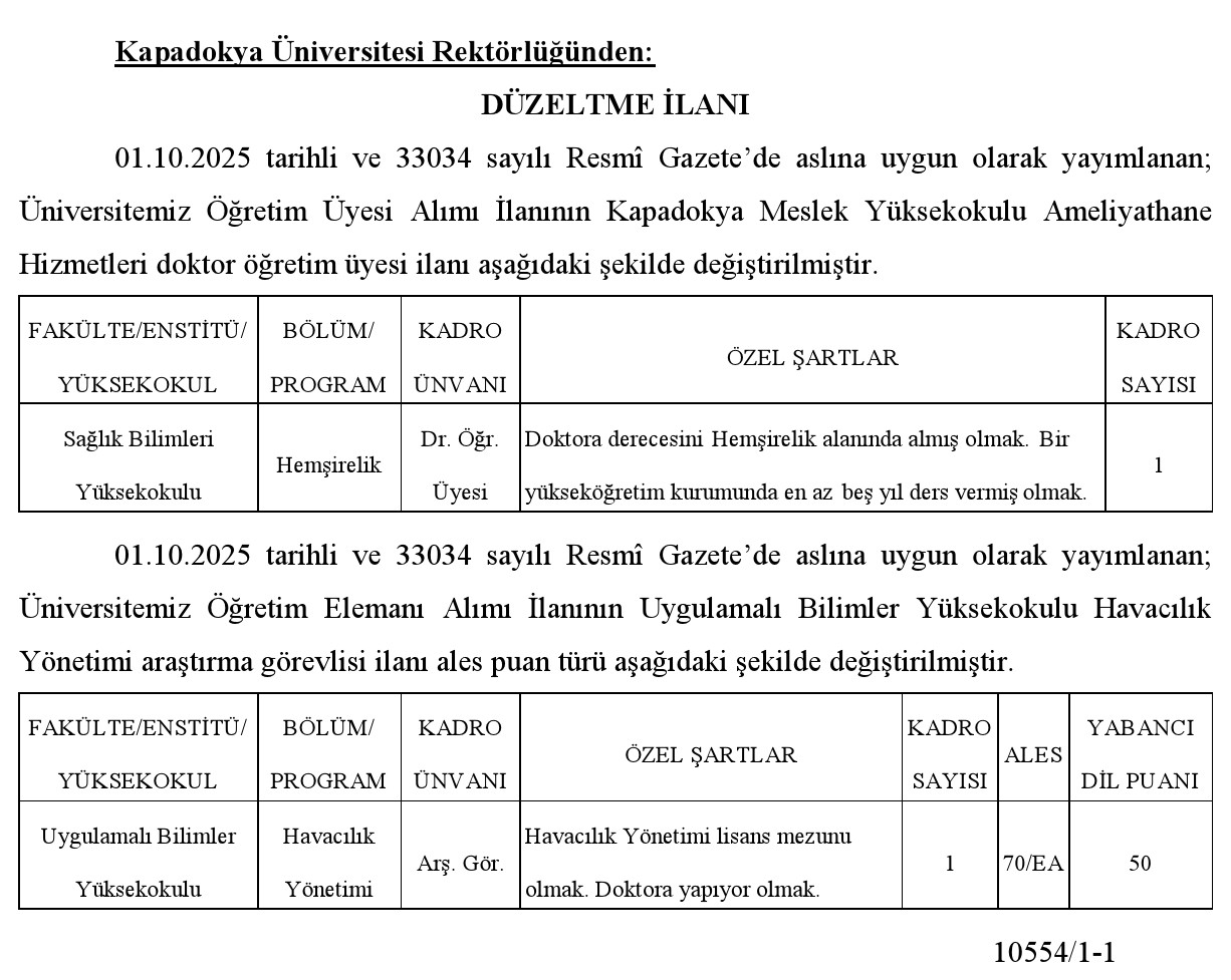 Kapadokya Üniversitesi öğretim üyesi ve öğretim elemanı alacak. Son başvuru tarihi 15 Ekim 2025