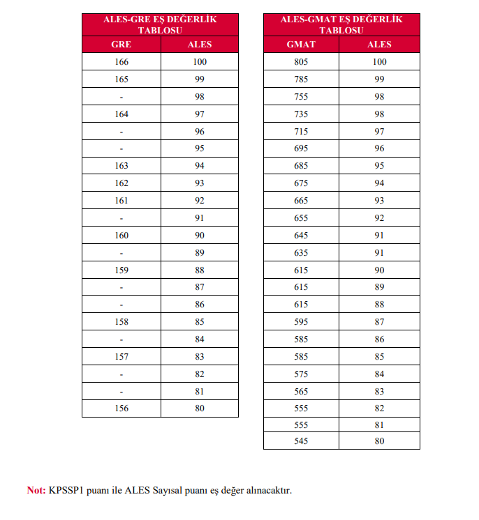 KPSS, ALES, GRE ve GMAT puanlarına göre aşağıdaki ALES Eş Değerlik Tablosu esas