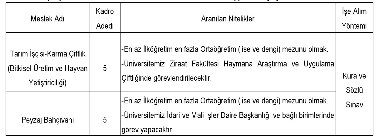 Üniversitemiz hizmet birimlerinde istihdam edilmek üzere; 4857 sayılı İş Kanunu, 2 sayılı Genel Kadro ve Usulü Hakkında Cumhurbaşkanlığı Kararnamesi ve Kamu Kurum ve Kuruluşlarına Eski Hükümlü veya Terörle Mücadelede Malul Sayılmayacak Şekilde Yaralananların İşçi Olarak Alınmasında Uygulanacak Usul ve Esaslar Hakkında Yönetmelik hükümleri çerçevesinde 10 adet eski hükümlü/TMY sürekli işçi alımı yapılacaktır.