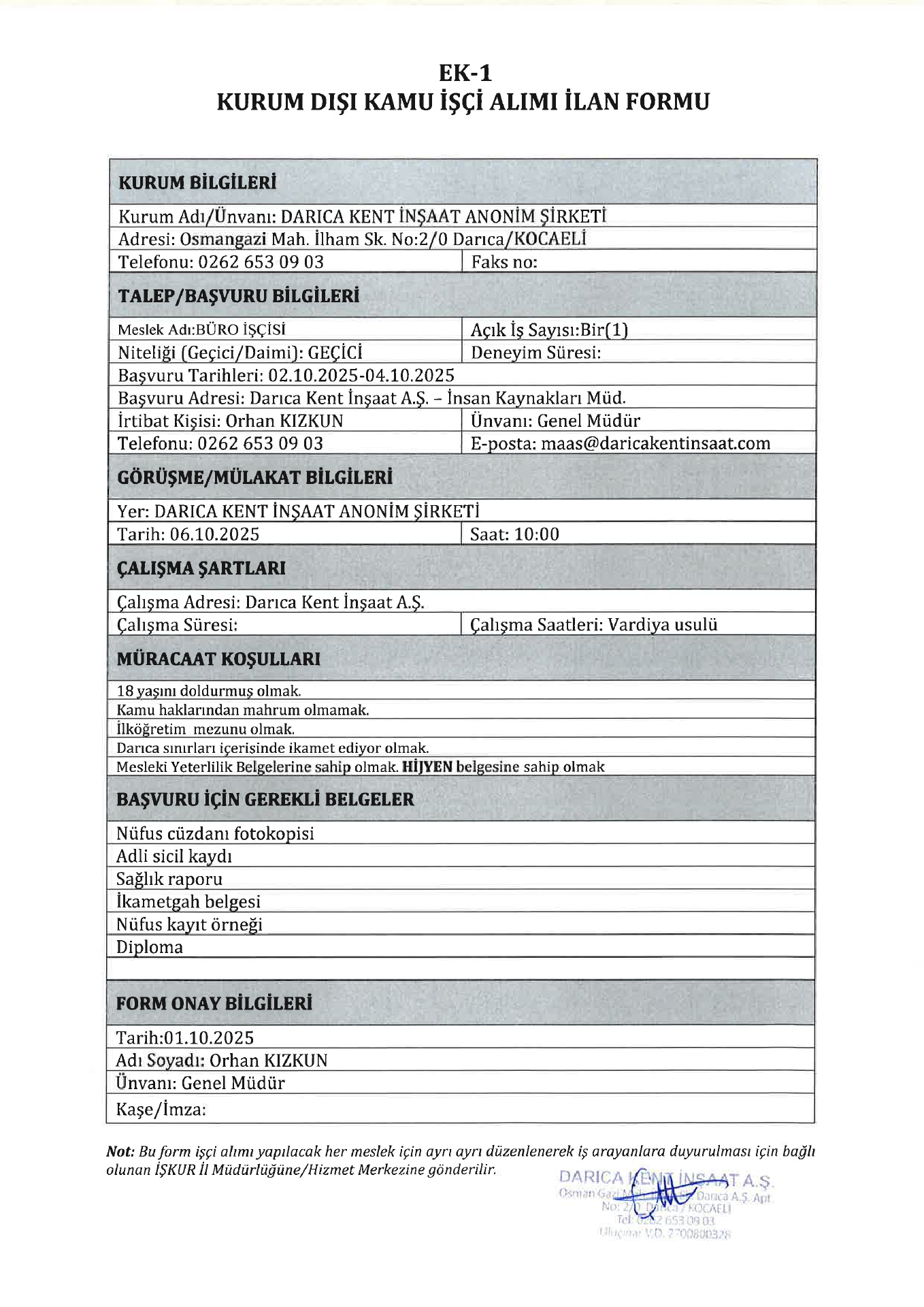 Kocaeli Darıca Kent İnşaat Geçici 1 İşçi Alacak. Son başvuru tarihi 4 Ekim 2025
