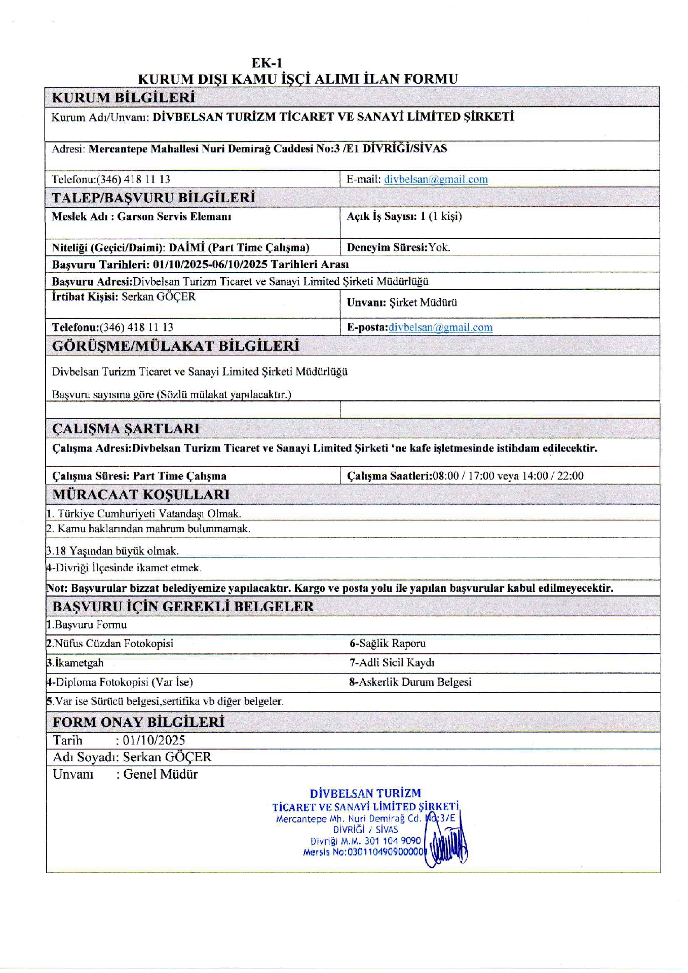 Sivas Divriği Belediyesi Geçici 1 İşçi Alacak. Son başvuru tarihi 6 Ekims 2025