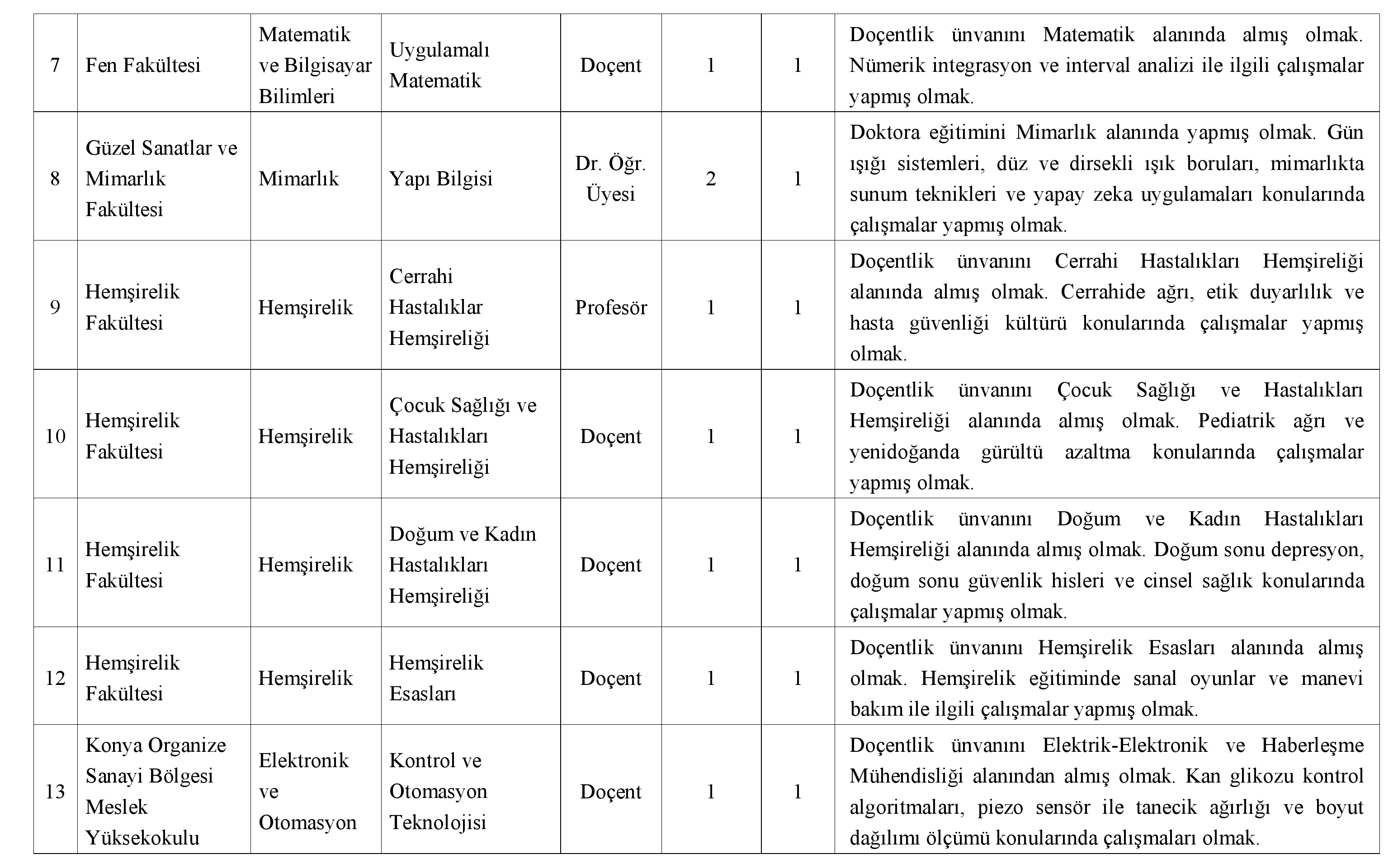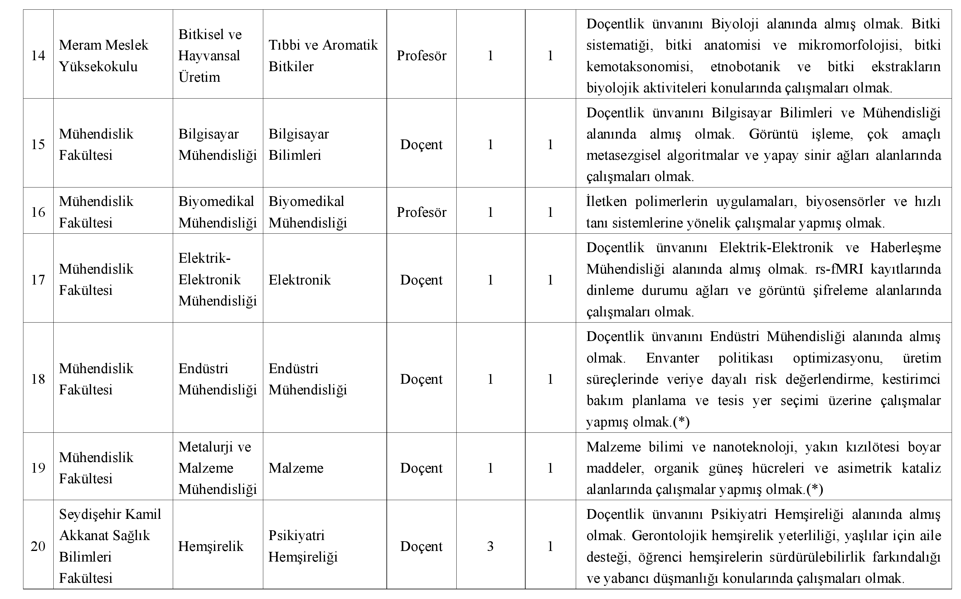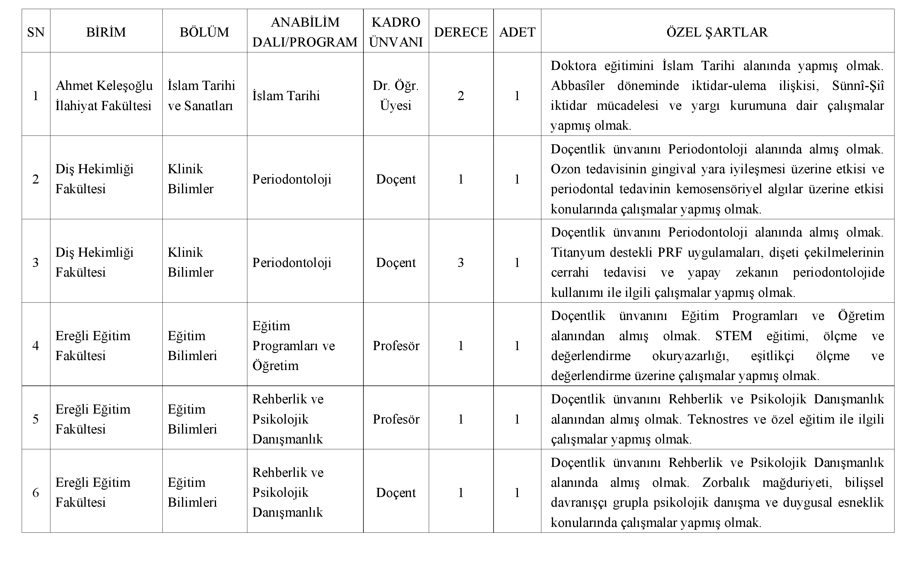 Üniversitemizin aşağıda belirtilen birimlerinde boş bulunan kadrolarına 2547 Sayılı Yükseköğretim Kanunu ve Öğretim Üyeliğine Yükseltilme ve Atanma Yönetmeliği'nin ilgili maddeleri ile Üniversitemiz Öğretim Üyeliğine Yükseltilme ve Atanma Yönergesi'nde belirtilen kriterler doğrultusunda öğretim üyesi alınacaktır. İlana başvuracak adayların 657 sayılı Devlet Memurları Kanunu'nun 48. maddesindeki genel şartları, ilanda belirtilen özel şartları taşımaları gerekmektedir. Adaylar; http://www.erbakan.edu.tr internet adresinden erişebilecekleri Üniversitemiz Öğretim Üyeliğine Yükseltilme ve Atanma Yönergesi'ne göre hazırlayacakları puan tablolarını dosyalarına eklemelidir.