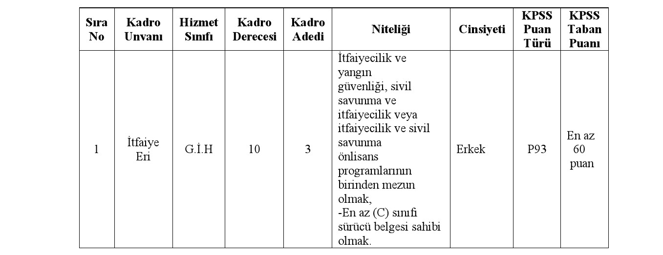 Bolu Belediye Başkanlığı bünyesinde, 657 sayılı Devlet Memurları Kanunu'na tabi olarak istihdam edilmek üzere; Belediye İtfaiye Yönetmeliği hükümlerine göre aşağıda unvanı, sınıfı, derecesi, adedi, nitelikleri, KPSS puan türü, KPSS taban puanı ve diğer şartları taşımak kaydıyla belirtilen boş kadrolara açıktan atama yoluyla itfaiye eri alımı yapılacaktır.