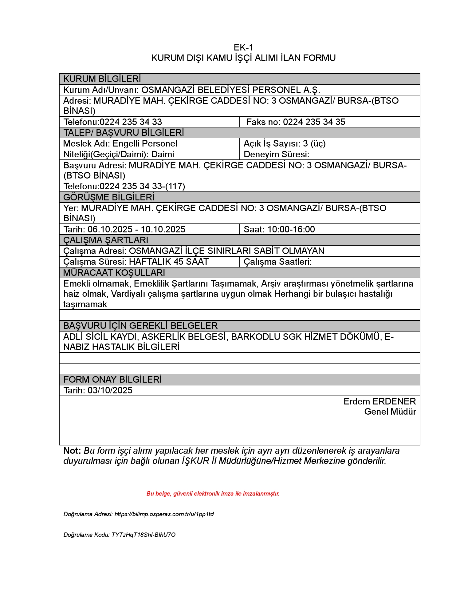 Bursa Osmangazi Belediyesi 3 Engelli İşçi Alacak. Son başvuru tarihi 10 Ekim 2025
