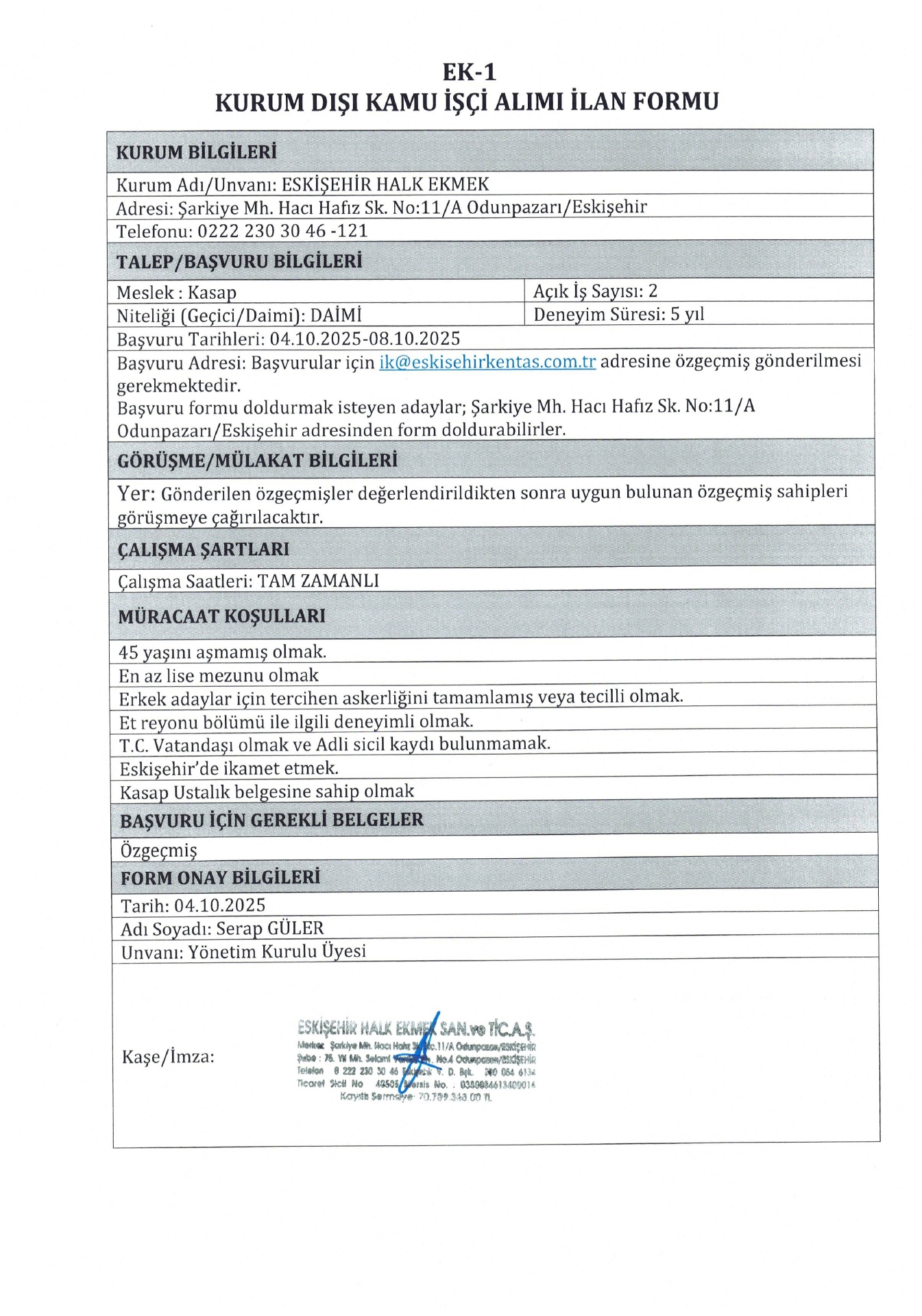 Eskişehir Halk Ekmek 2 İşçi Alacak. Son başvuru tarihi 8 Ekim 2025