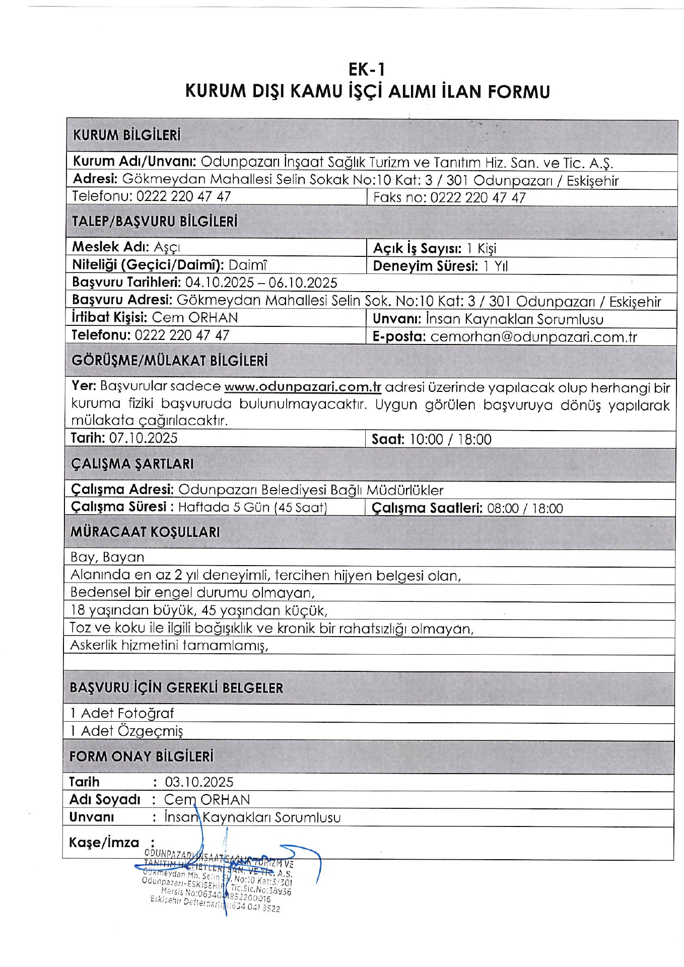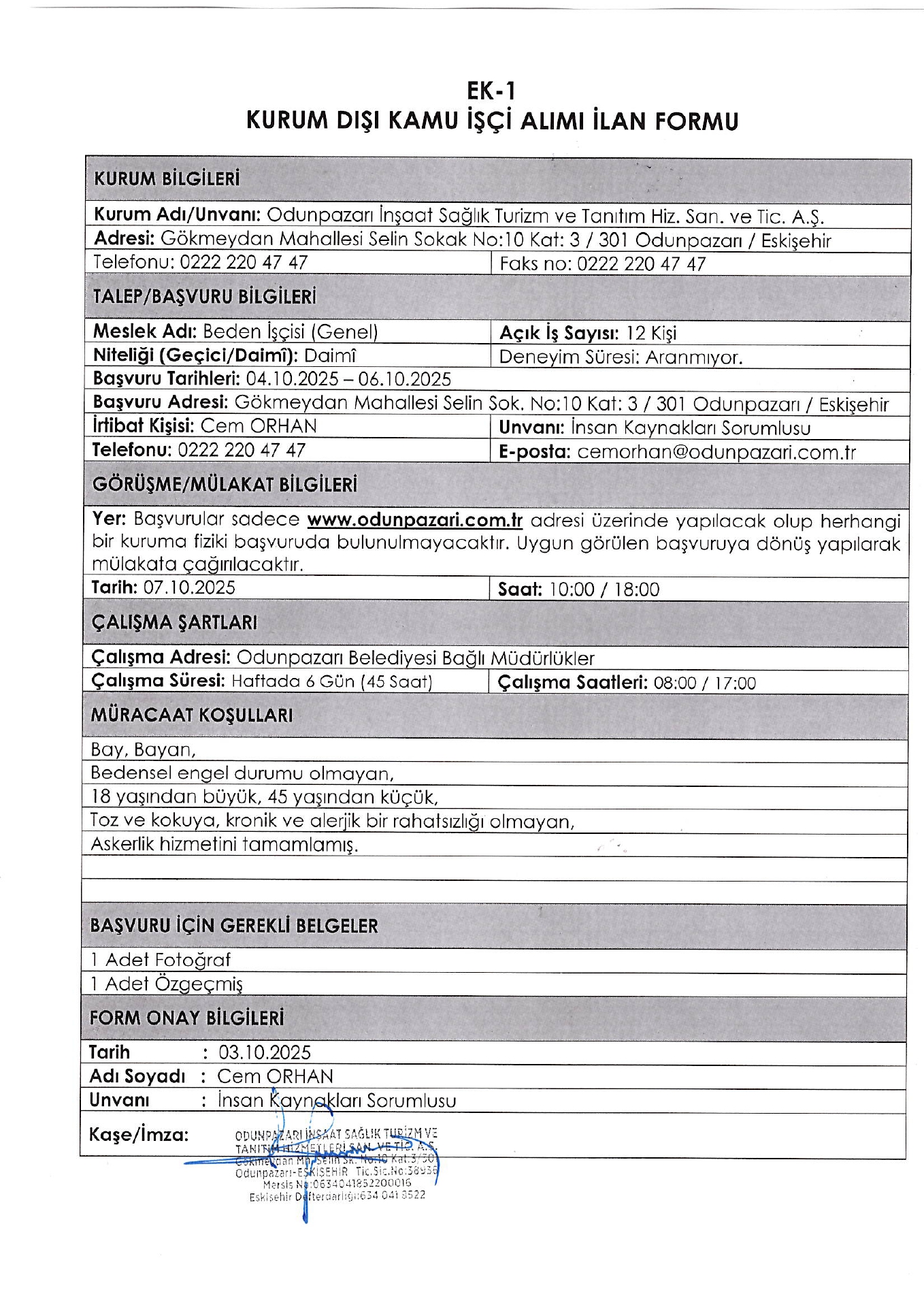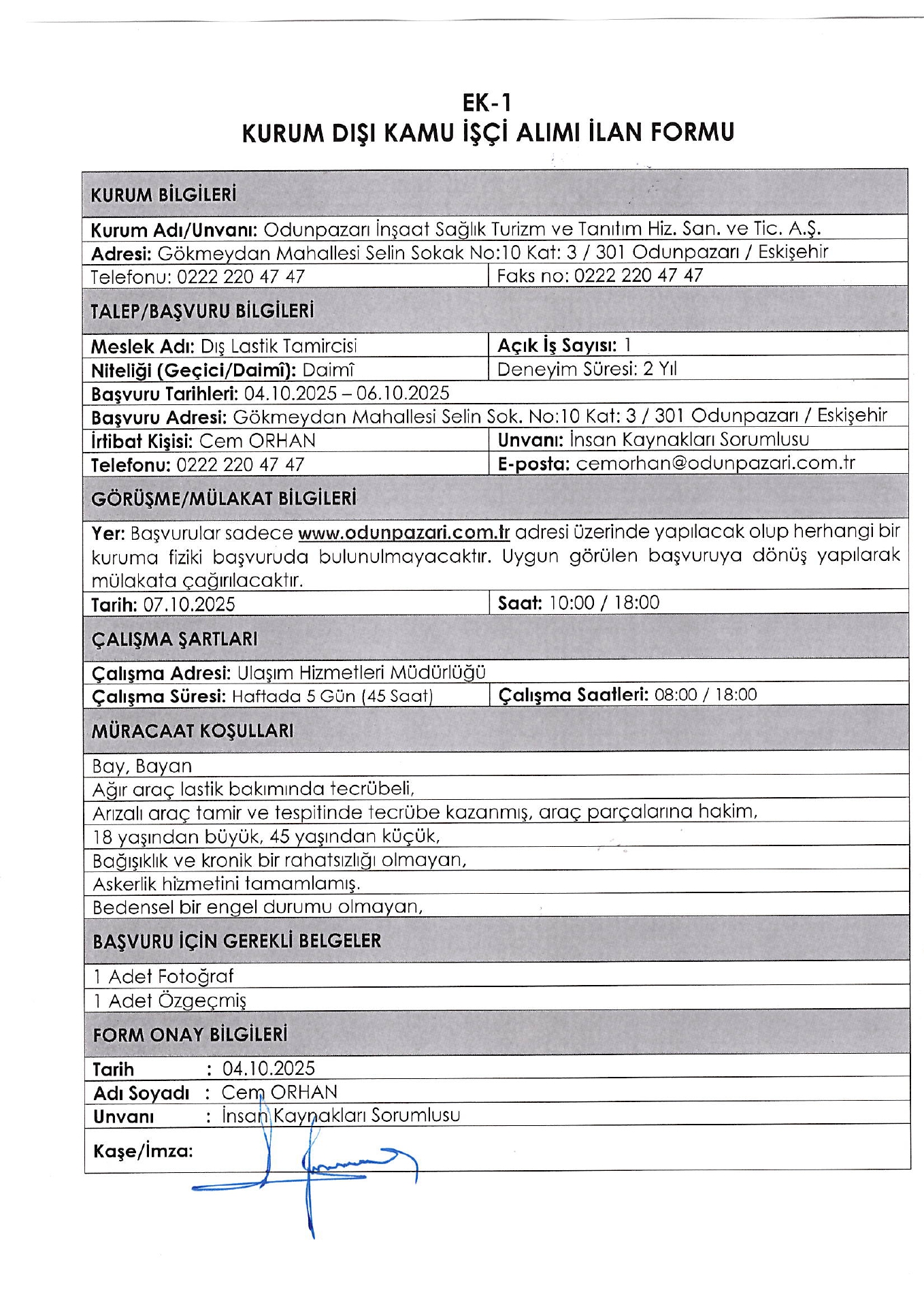 Eskişehir Odunpazarı İnşaat 14 İşçi Alacak. Son başvuru tarihi 6 Ekim 2025