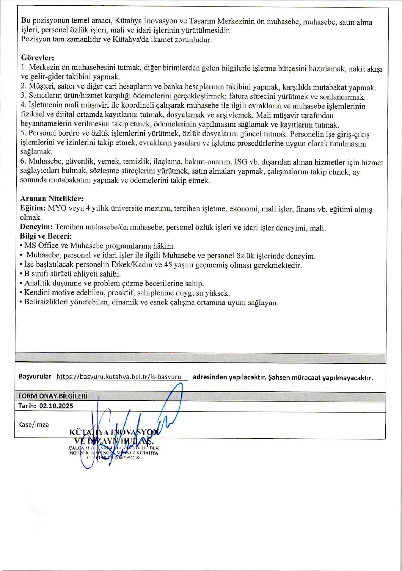 Kütahya İnovasyon ve Dizayn 1 İşçi Alacak. Son başvuru tarihi 6 Ekim 2025