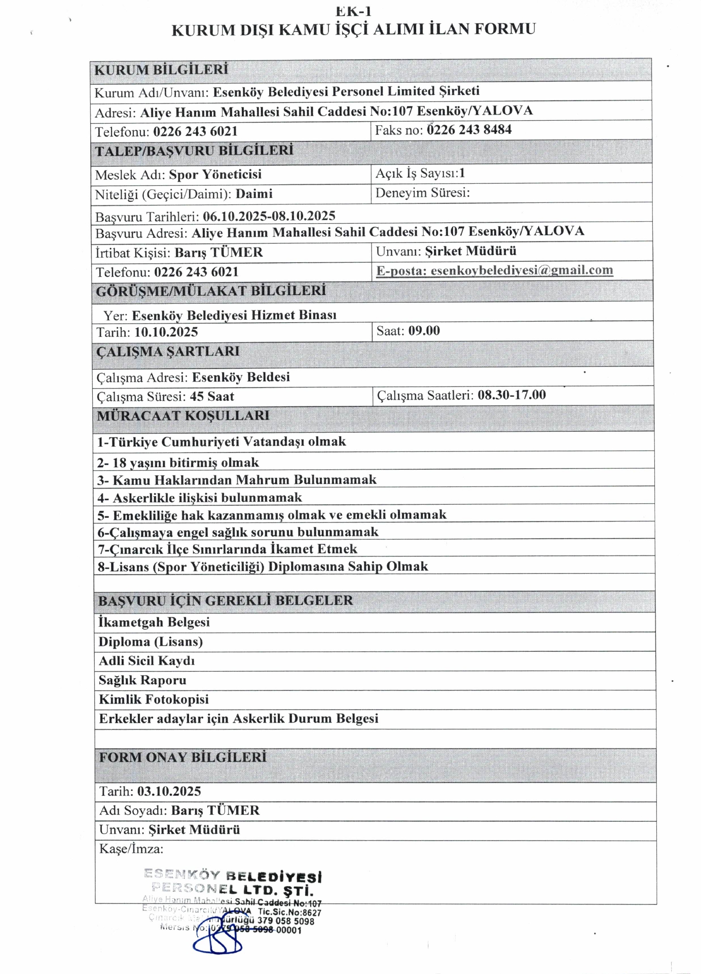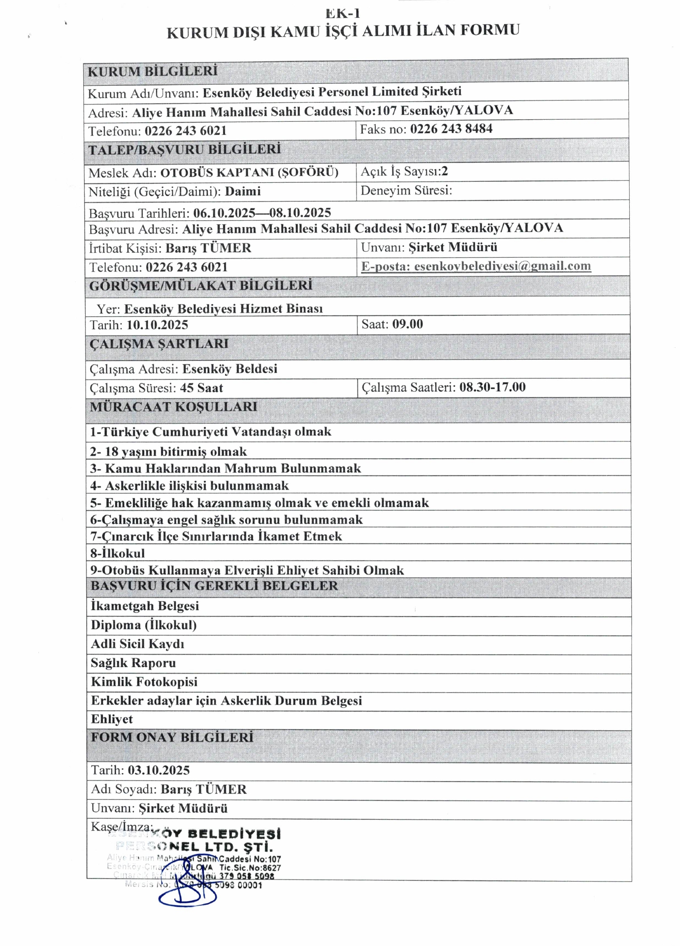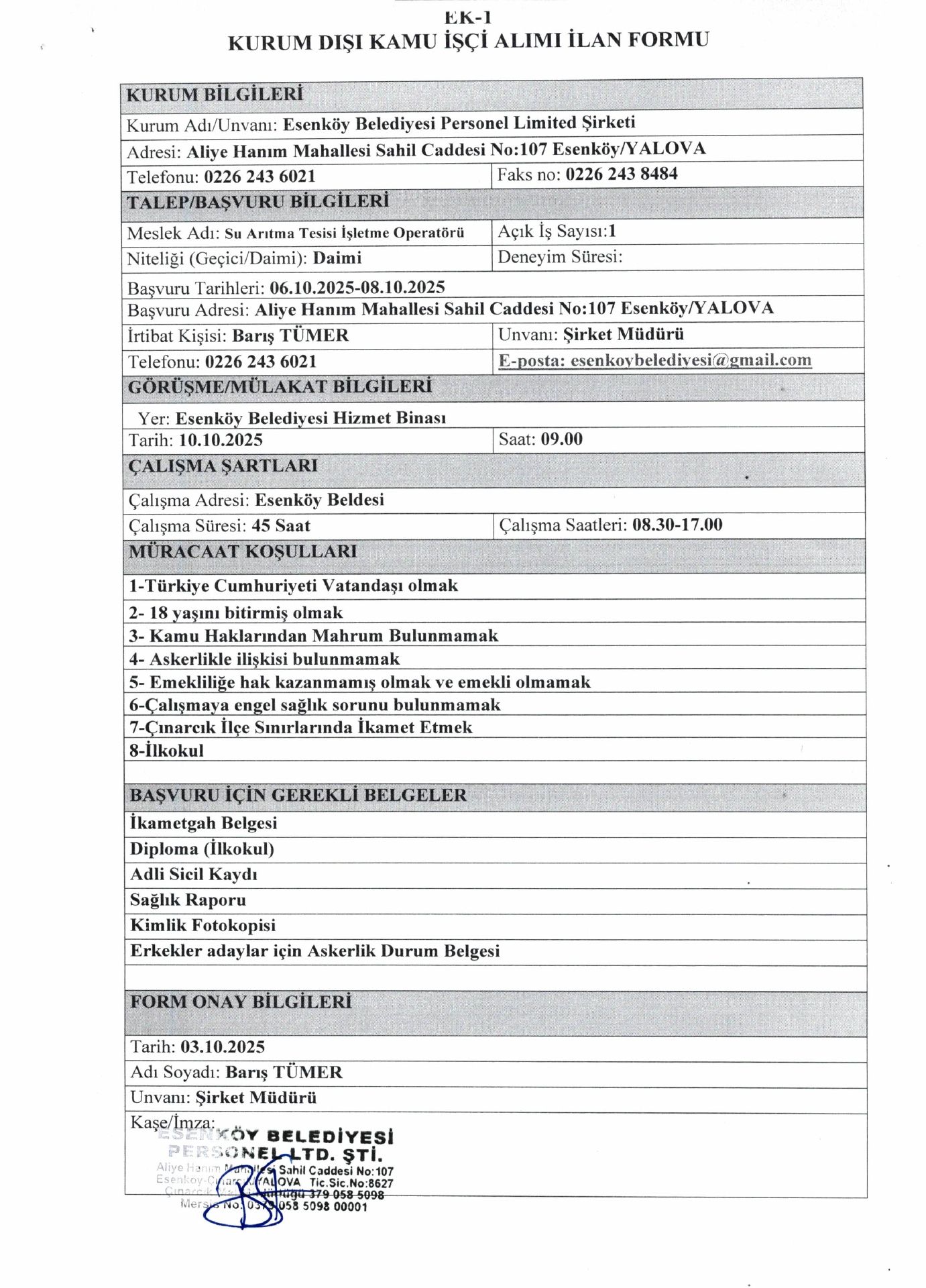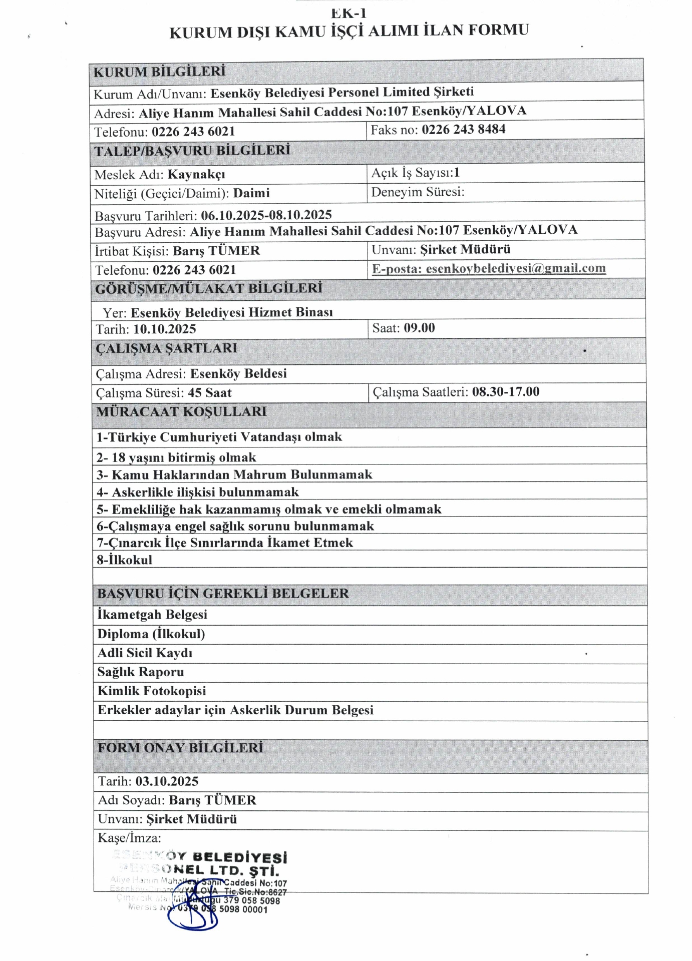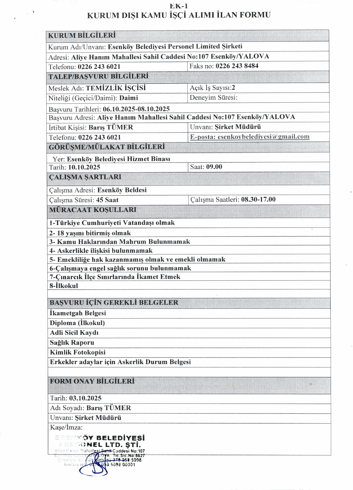 Yalova Esenköy Belediyesi 7 İşçi Alacak. Son başvuru tarihi 8 Ekim 2025