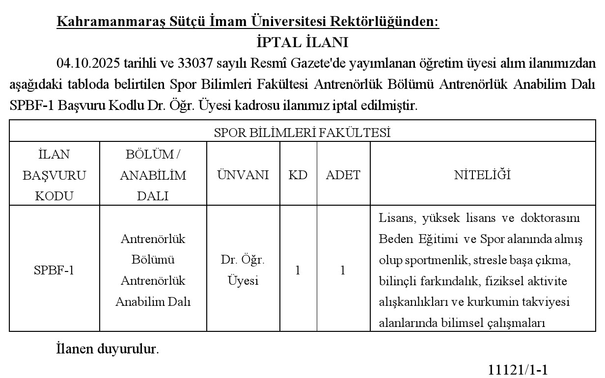 Kahramanmaraş Sütçü İmam Üniversitesi Öğretim Üyesi Alım İlanı. Son başvuru tarihi 18 ekim 2025