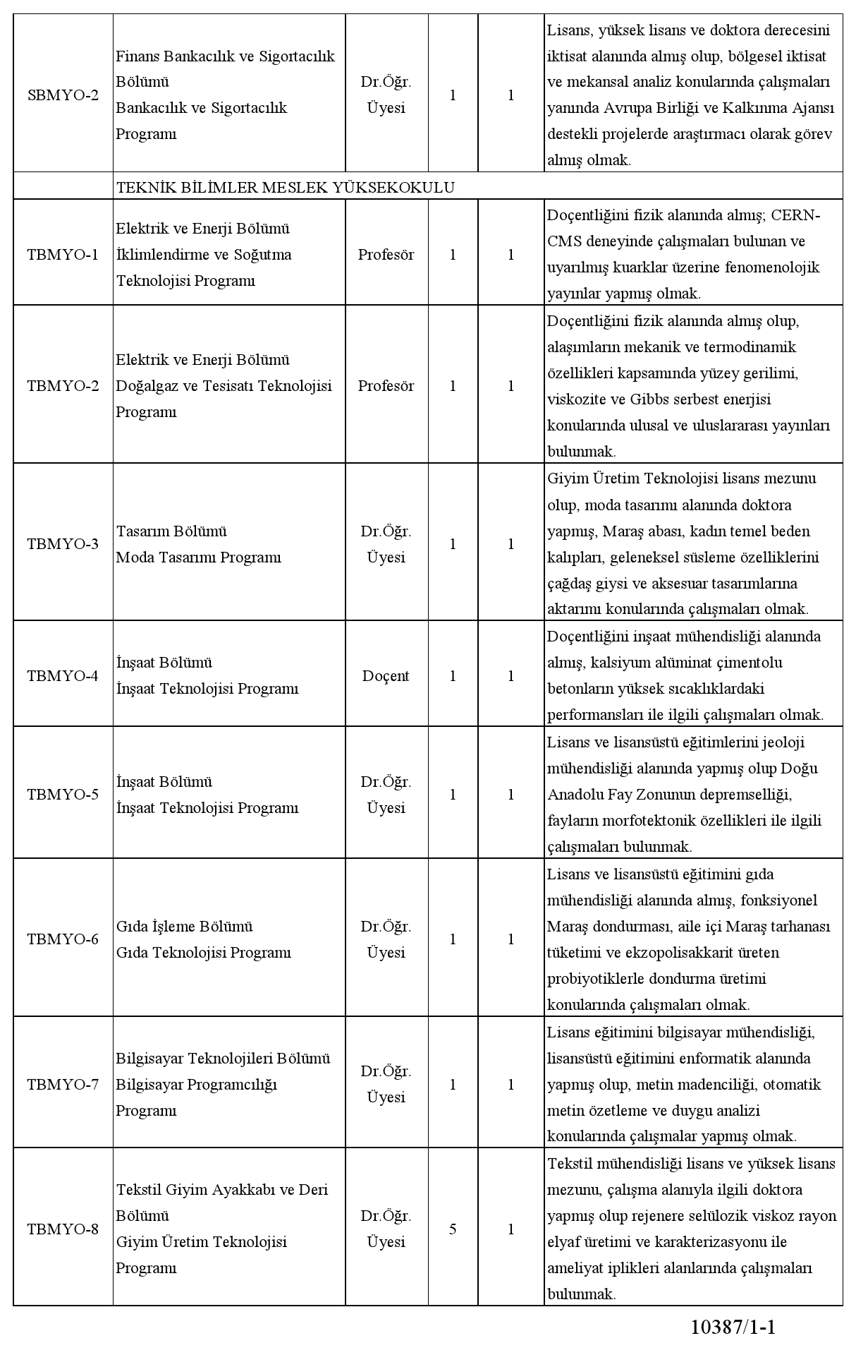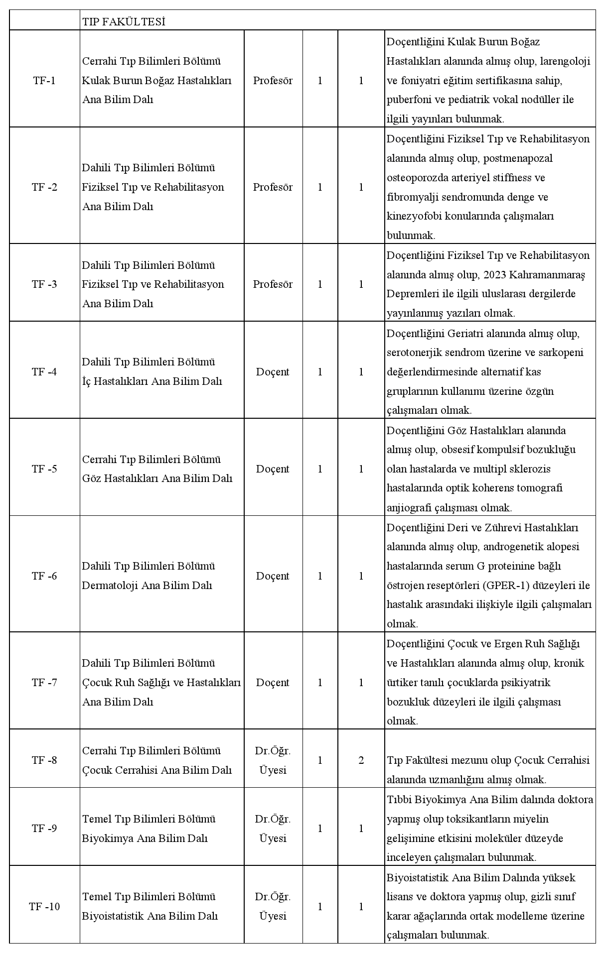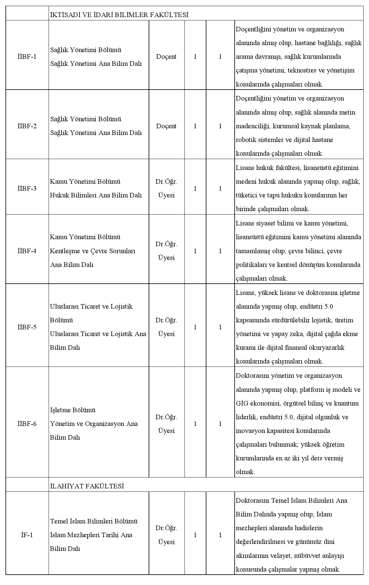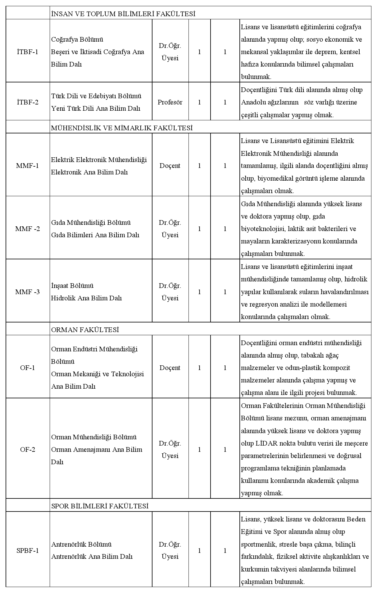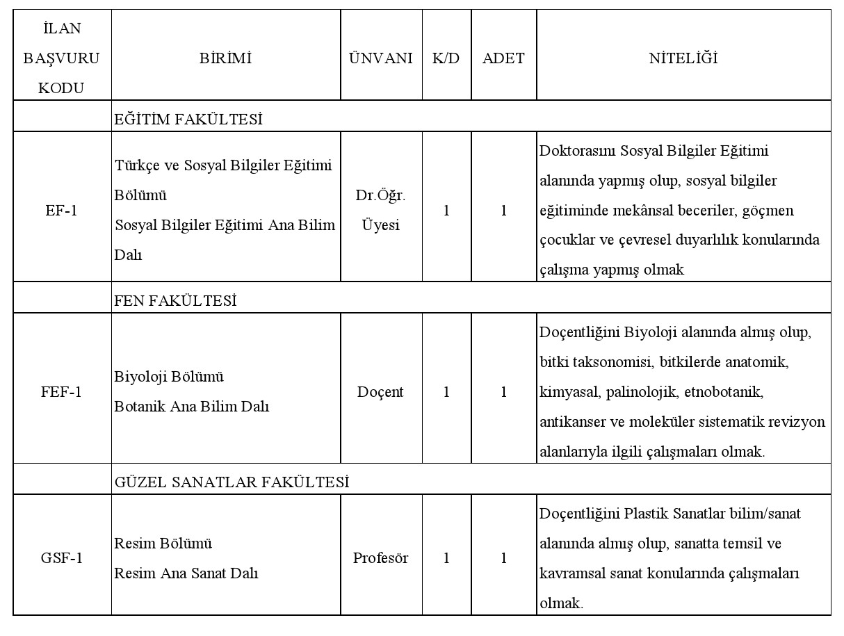 . Üniversitemizin aşağıda belirtilen birimlerine, 2547 sayılı Yükseköğretim Kanunu, Öğretim Üyeliğine Atanma ve Yükseltilme Yönetmeliği ile Üniversitemiz Öğretim Üyeliğine Atama, Yükseltme Ölçütleri ve Uygulama Esaslarına uygun olarak, 657 sayılı Kanunun 48. maddesindeki genel şartları ve ilanda belirtilen şartları sağlamaları kaydıyla öğretim üyesi alınacaktır.