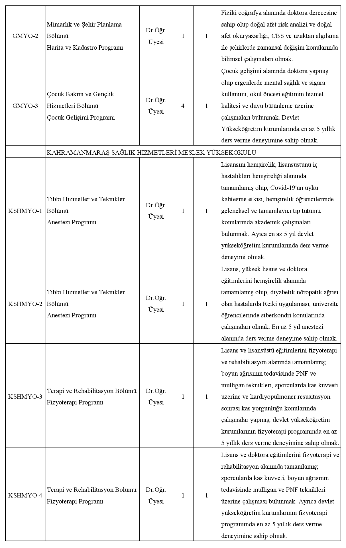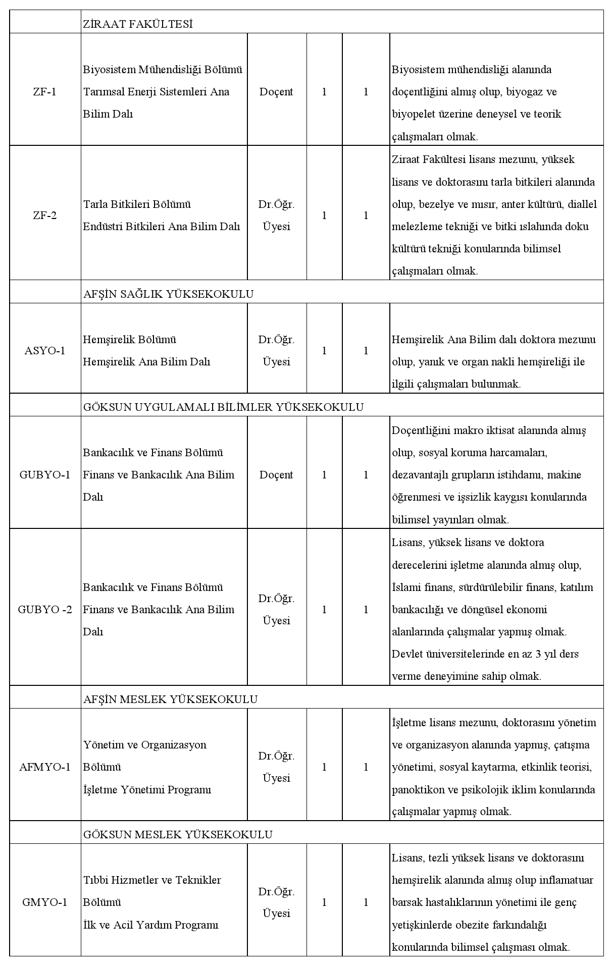 Kahramanmaraş Sütçü İmam Üniversitesi Öğretim Üyesi Alım İlanı- Güncellendi