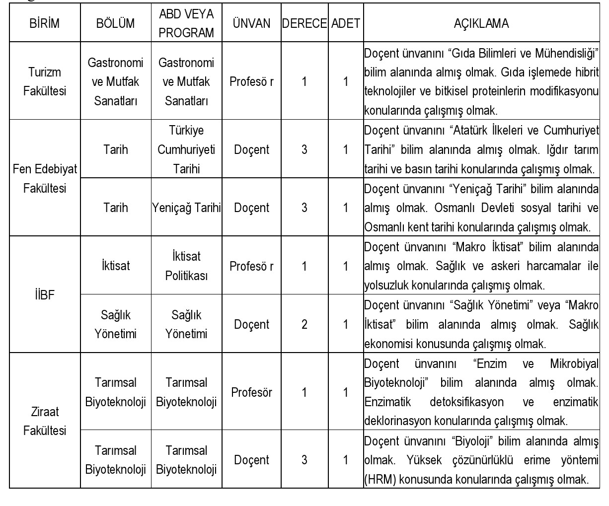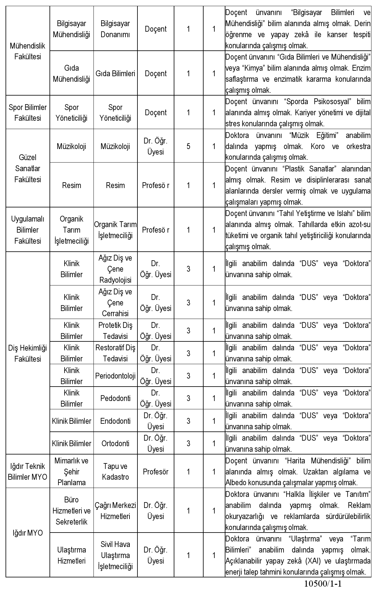 Üniversitemizin aşağıda belirtilen birimlerine 2547 sayılı Kanunun ve Öğretim Üyeliğine Yükseltilme ve Atanma Yönetmelik'in ilgili maddeleri uyarınca öğretim üyesi alınacaktır. Başvuracak adayların, 657 sayılı Kanunun 48. maddesindeki genel ve özel şartları sağlamış olmaları, üniversitemiz senatosunca kabul edilen ve Yükseköğretim Kurulu Başkanlığınca onaylanan (https://www.igdir.edu.tr/yonergeler) adresinde "Iğdır Üniversitesi Öğretim Üyeliğine Yükseltilme ve Atanma Kriterleri Yönergesinde'' belirtilen kriterleri taşımaları gerekmektedir. Anılan kriterlere uygun olmayan başvurular kabul edilmeyecektir. Adayların fakültelerin veya 4 yıllık yüksekokulların ilgili bölümlerinden mezun olmaları (yurt dışından alınan diploma denkliklerinin, Yükseköğretim Kurulunca onaylanmış olması şarttır.)