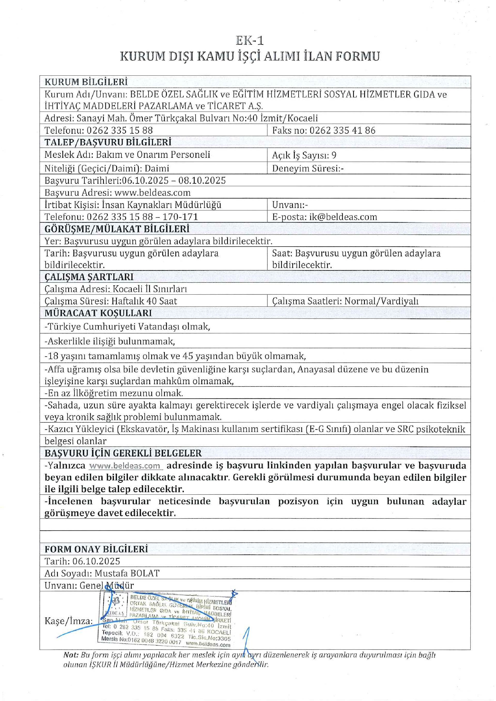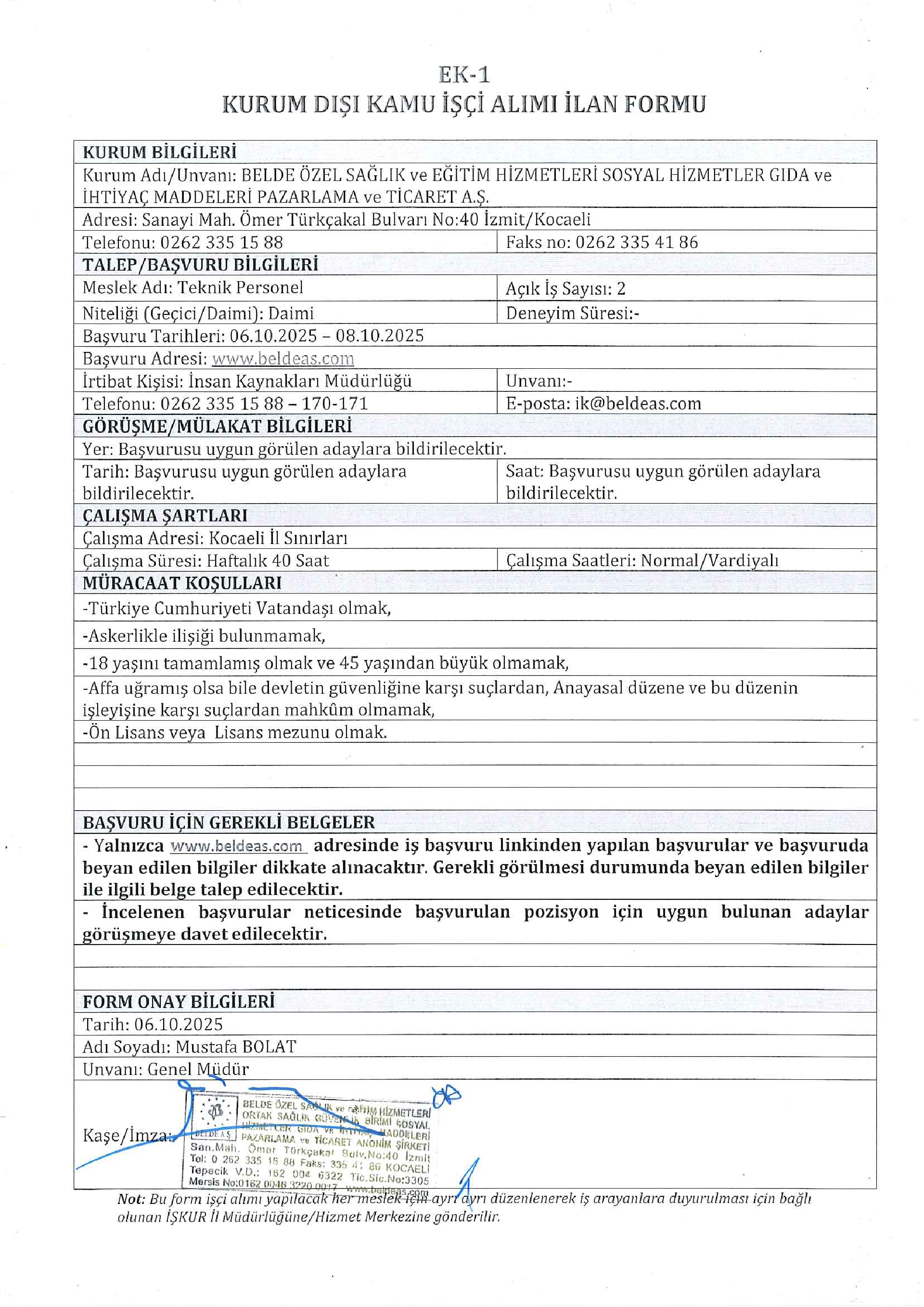 Kocaeli Belde Özel Sağlık Hizmetleri 11 İşçi Alacak. Son başvuru tarihi 8 Ekim 2025