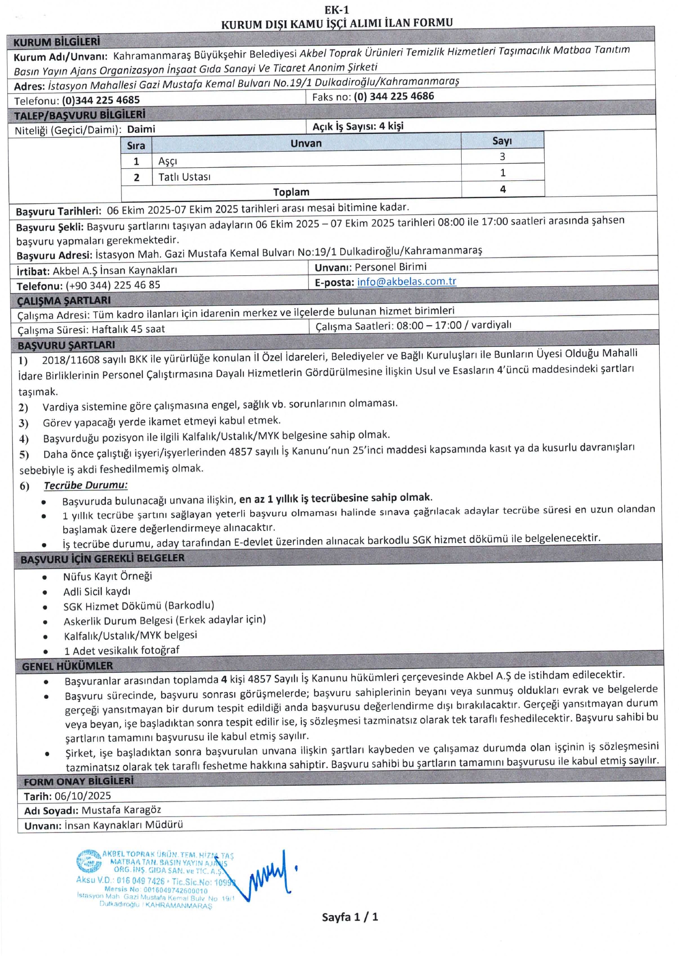 Kahramanmaraş Büyükşehir Belediyesi 4 İşçi Alacak. Son başvuru tarihi 7 Ekim 2025