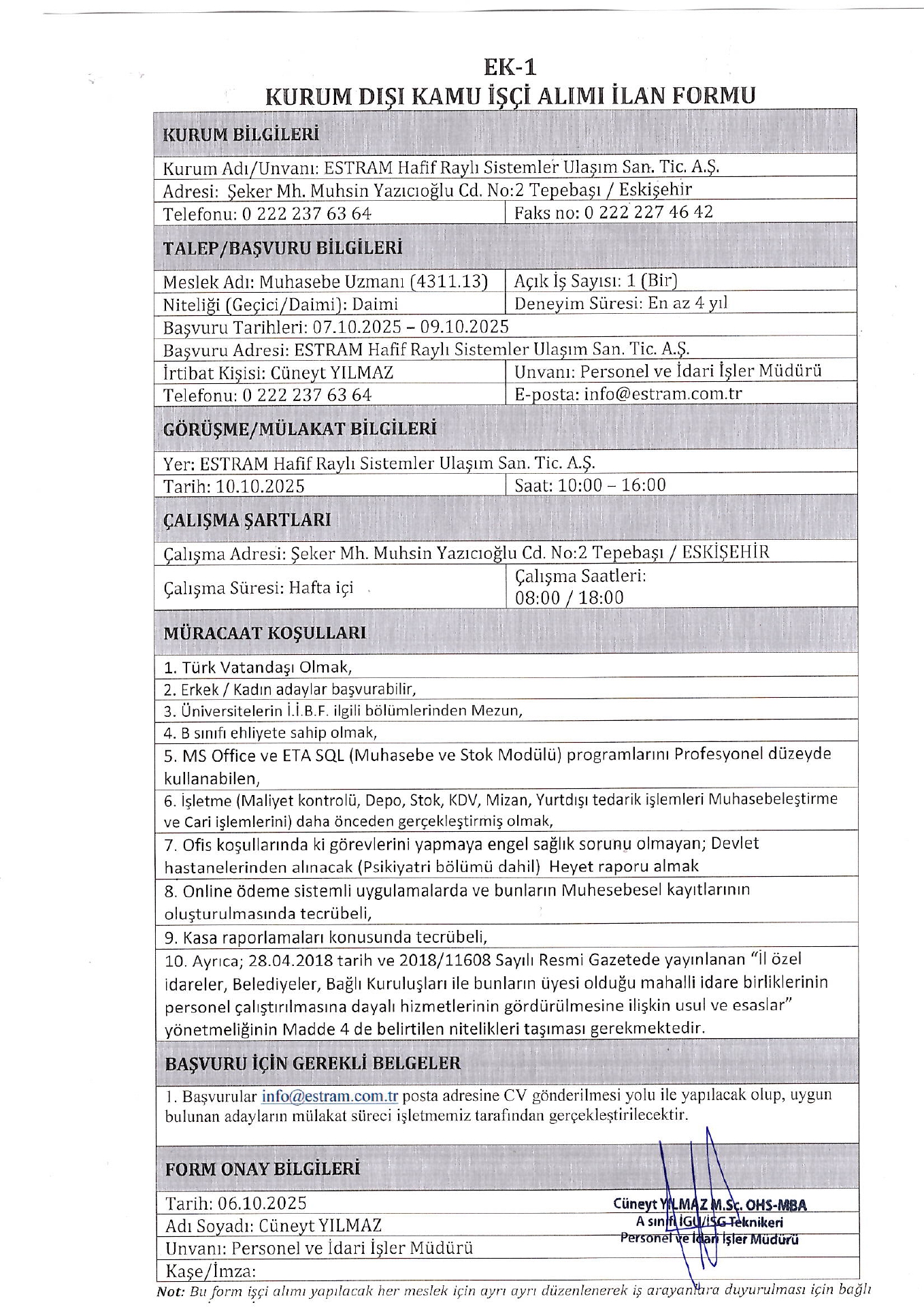 Eskişehir Estram 1 İşçi Alacak. Son başvuru tarihi 9 Ekim 2025