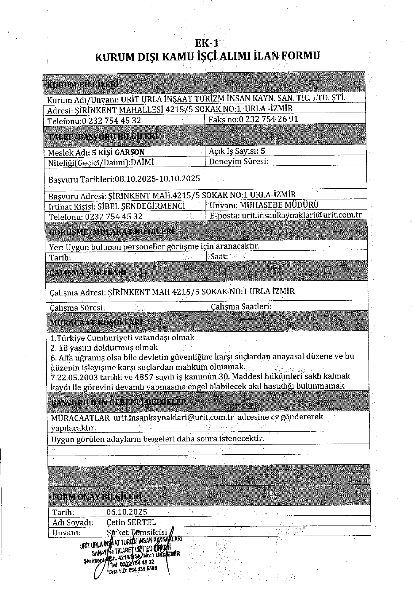İzmir Urit Urla İnşaat 5 İşçi Alacak. Son başvuru tarihi 10 Ekim 2025