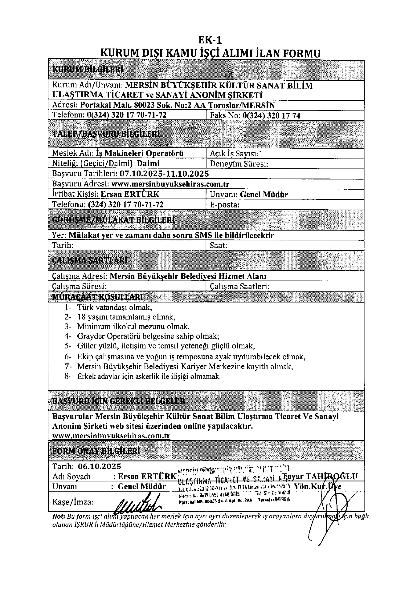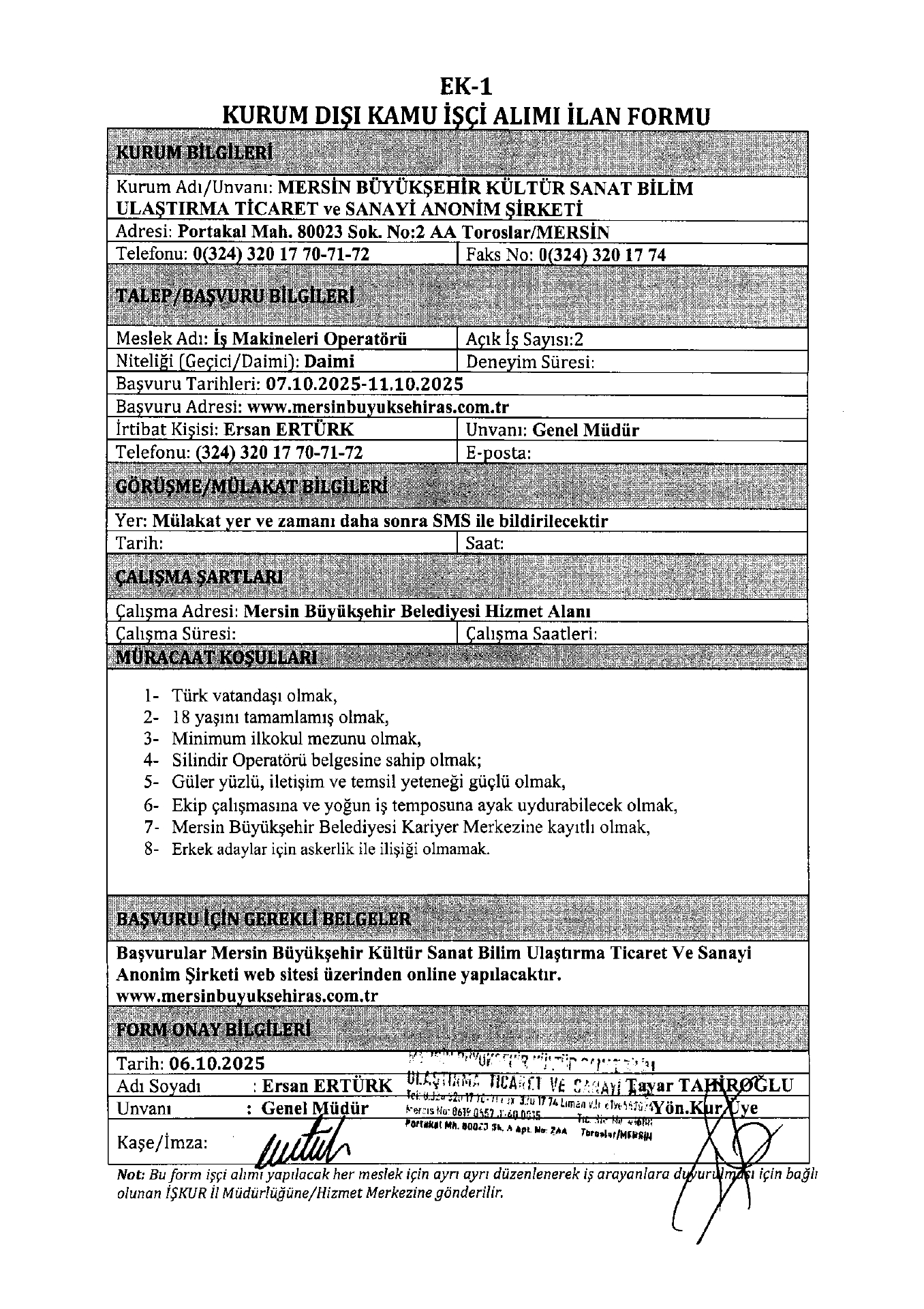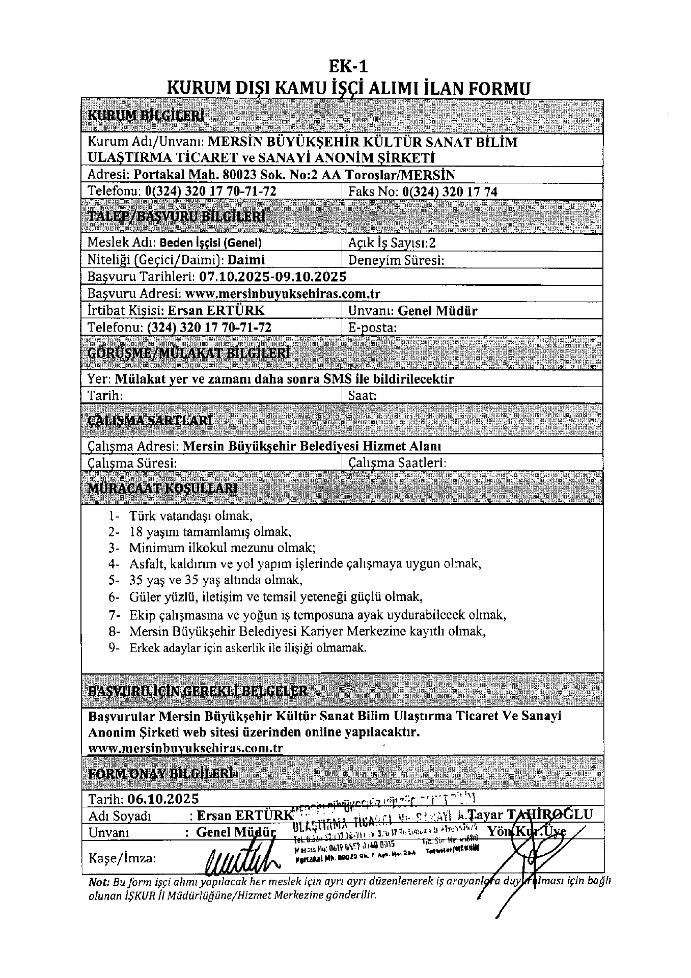Mersin Büyükşehir Belediyesi 14 İşçi Alacak. Son başvuru tarihi 11 Ekim 2025