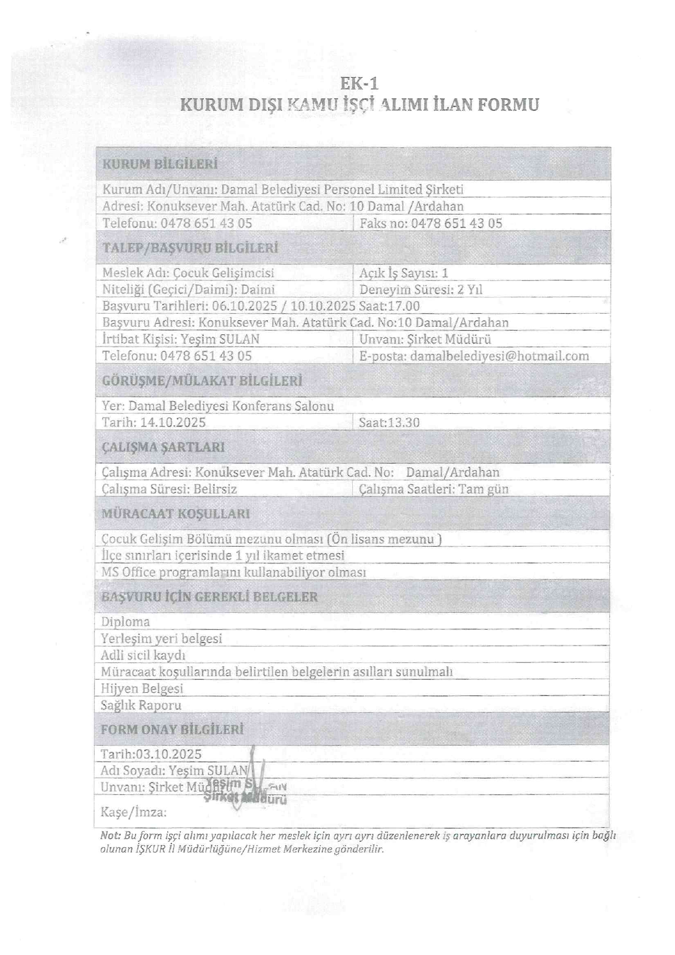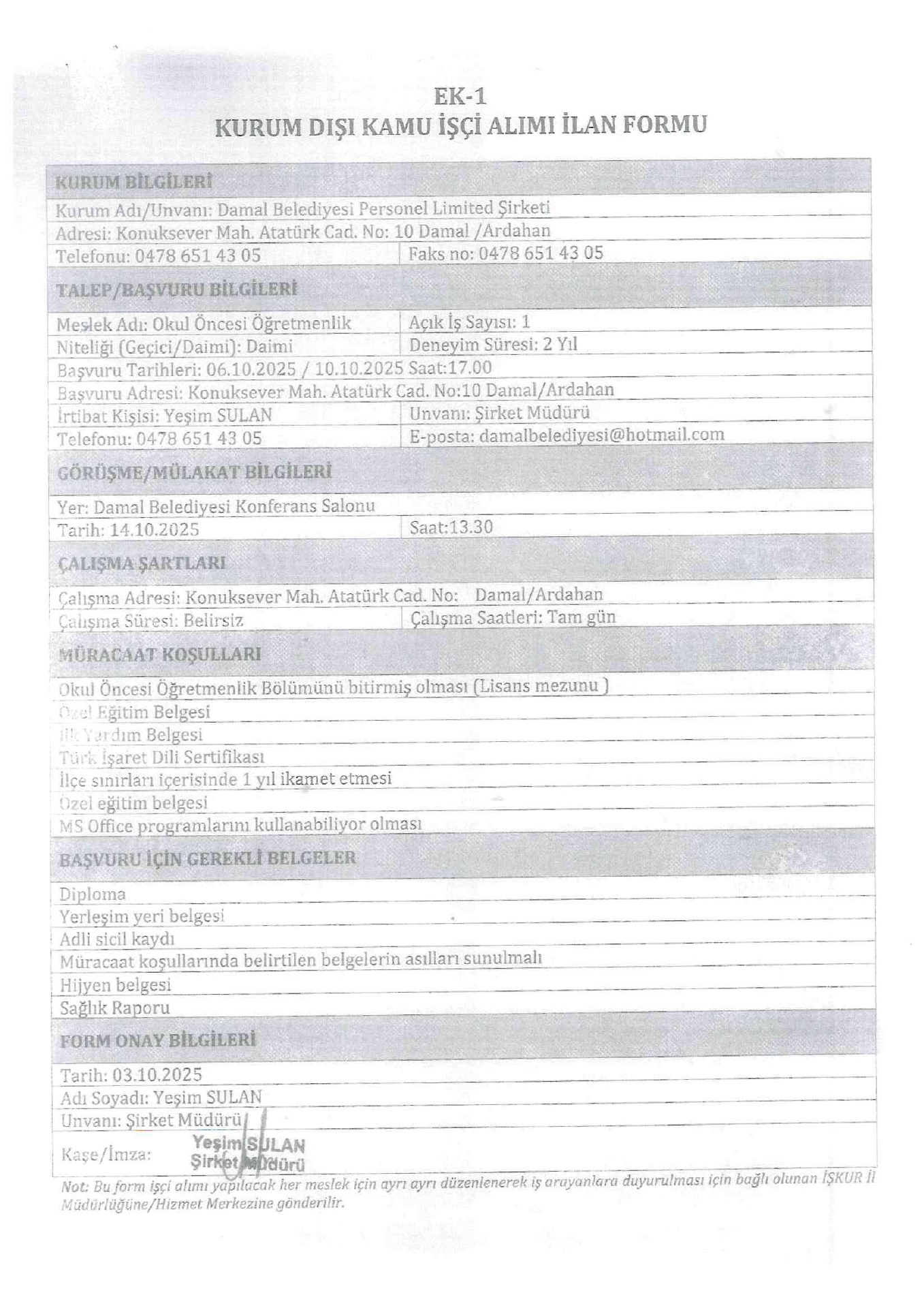 Ardahan Damal Belediyesi 2 İşçi Alacak. Son başvuru tarihi 10 Ekim 2025