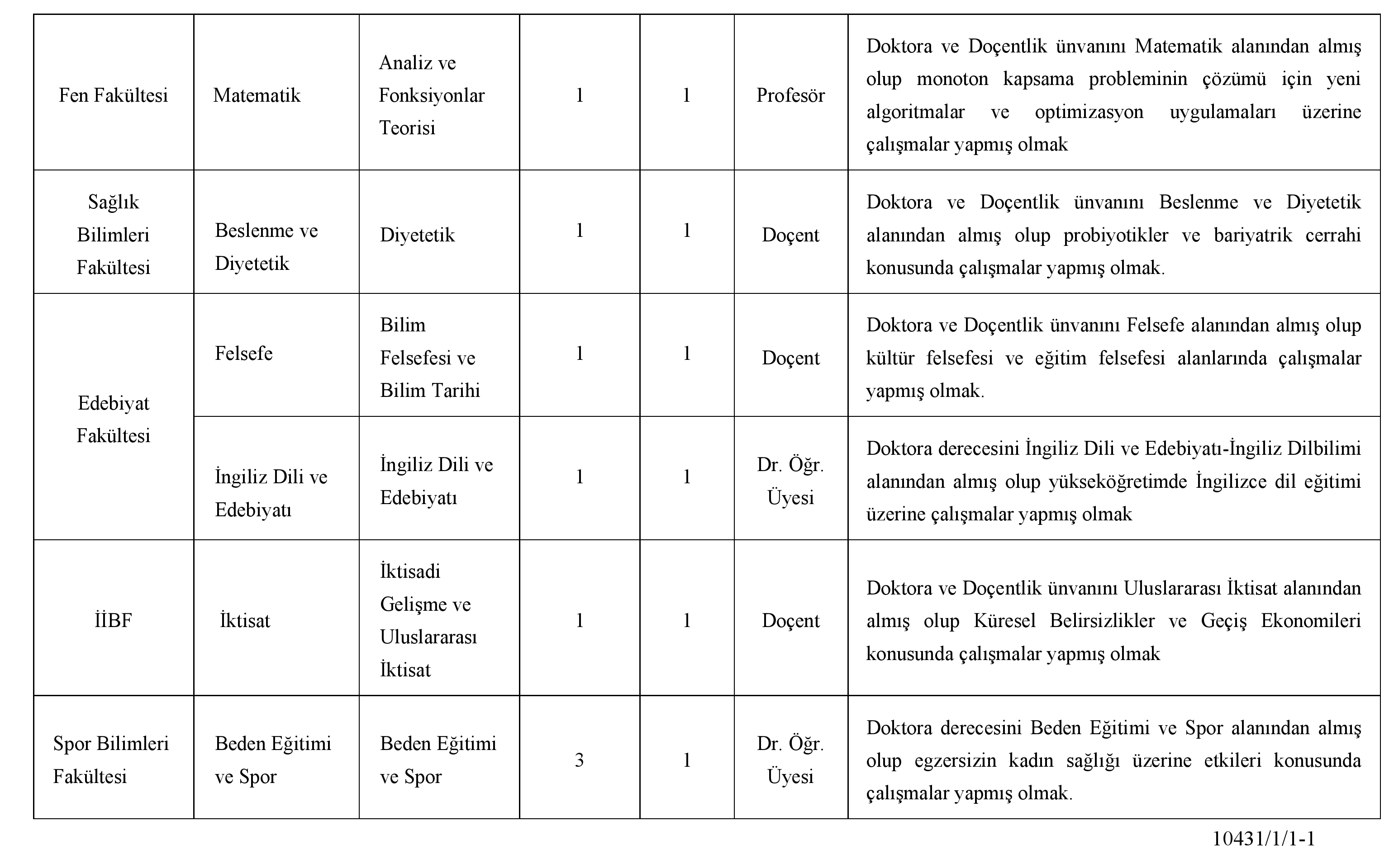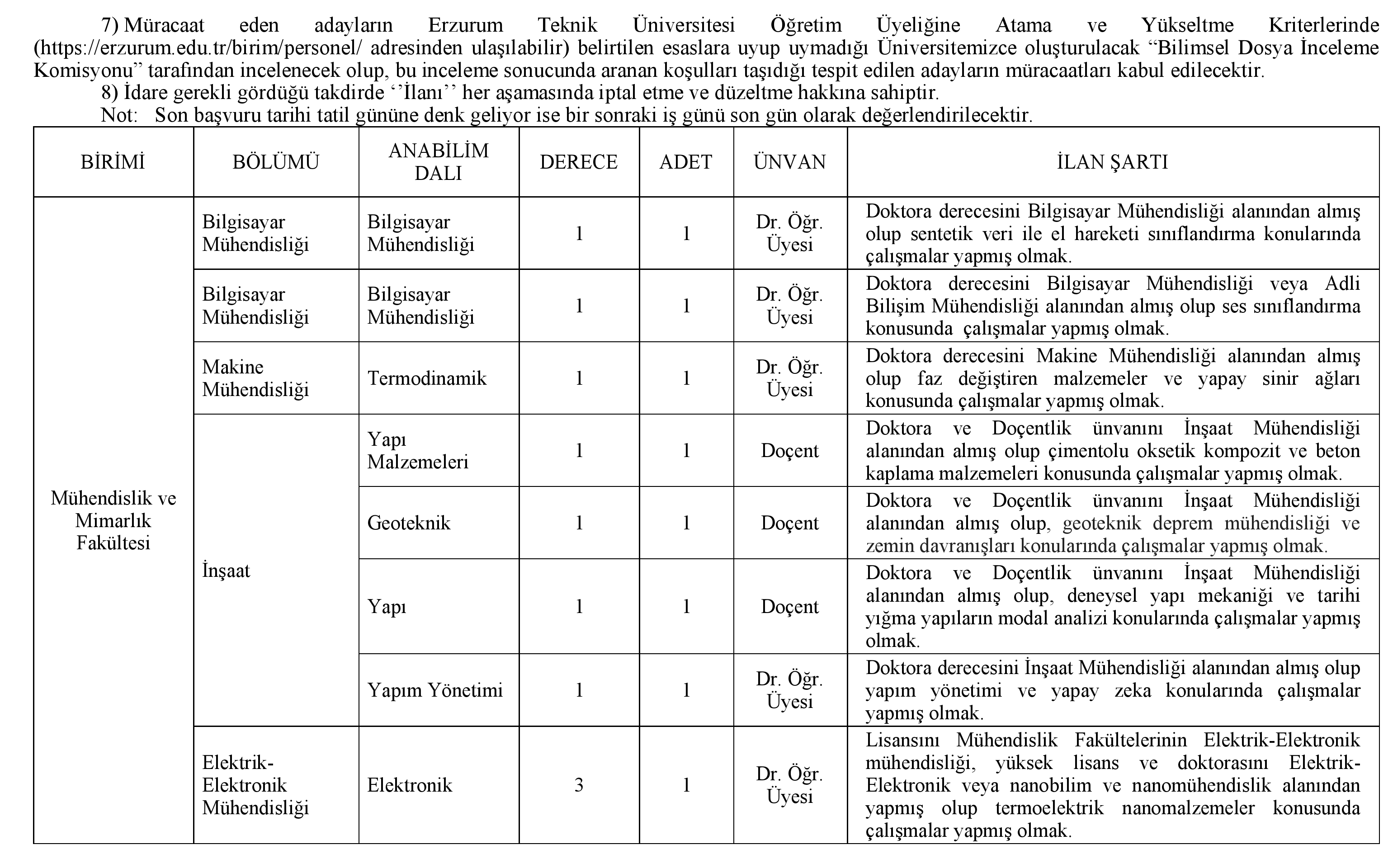 Üniversitemize aşağıda ünvanı, derecesi ve nitelikleri belirtilen kadrolara; 2547 sayılı Yükseköğretim Kanunu'nun ilgili maddeleri ile bu Kanun'a dayanılarak Yükseköğretim Kurulu Başkanlığınca yayınlanan Öğretim Üyeliğine Yükseltilme ve Atanma Yönetmeliğinin ilgili maddeleri uyarınca, Erzurum Teknik Üniversitesi Öğretim Üyesi Kadrolarına Atama ve Yükseltme Kriterleri'nde belirtilen şartları sağlamış olmak koşuluyla öğretim üyesi alınacaktır.