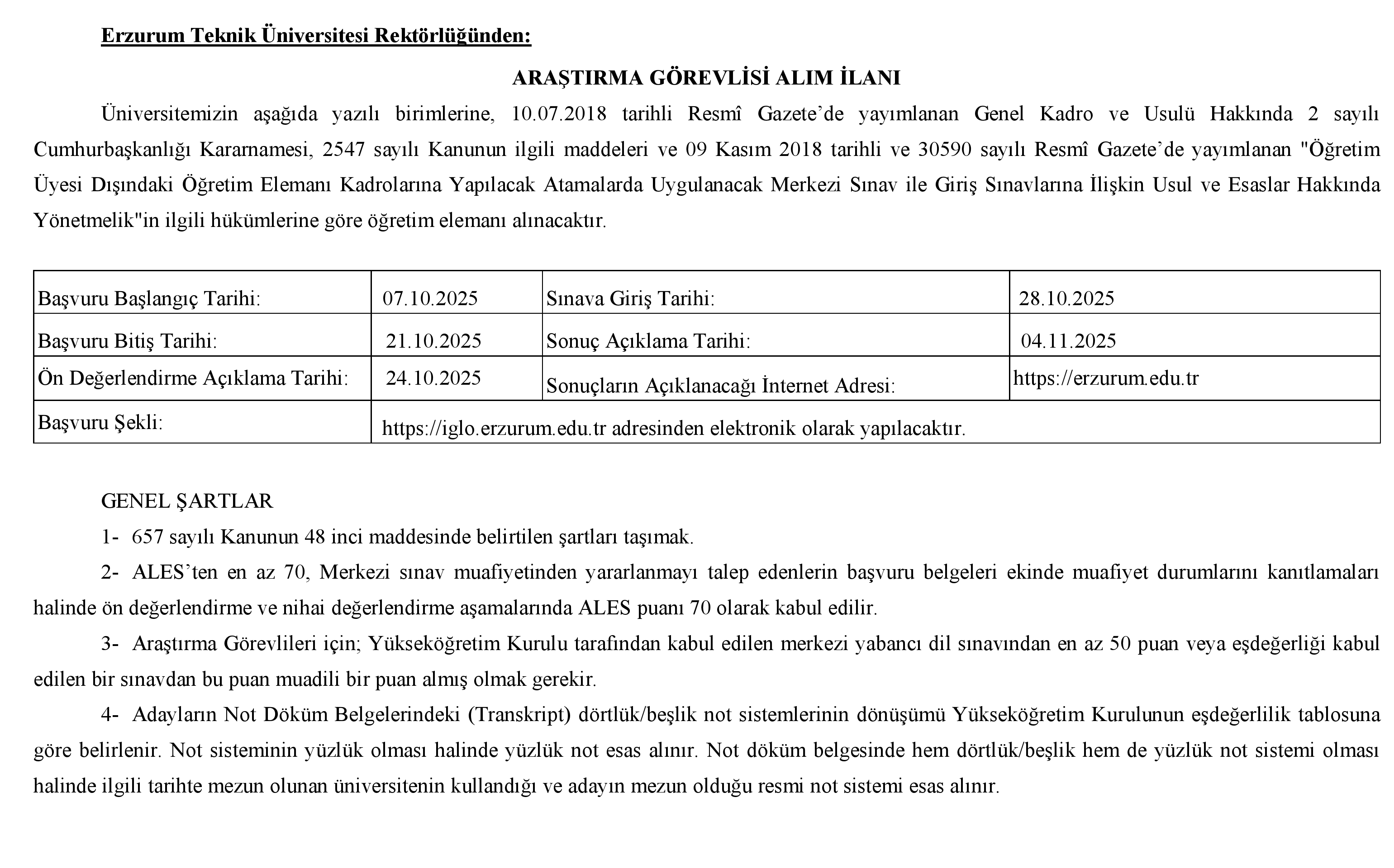 1- Son başvuru tarihi ilanın Resmi Gazete'de yayımlandığı tarihten itibaren 15 (on beş) gündür. Başvurular https://iglo.erzurum.edu.tr adresinden elektronik olarak yapılacaktır. Zamanında yapılmayan, eksik belgeli başvurular ile posta yoluyla ve fiziksel olarak yapılan başvurular kabul edilmeyecektir.