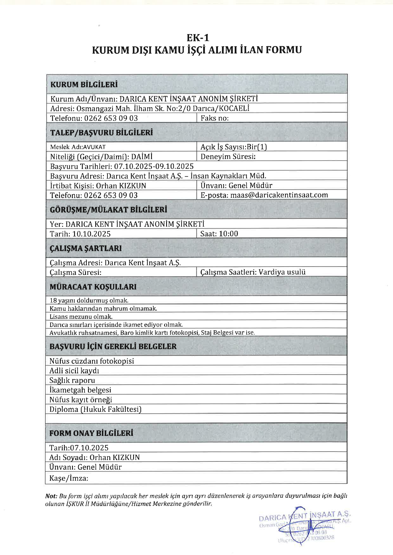 Kocaeli Darıca Kent İnşaat 1 İşçi Alacak. Son başvuru tarihi 9 Ekim 2025