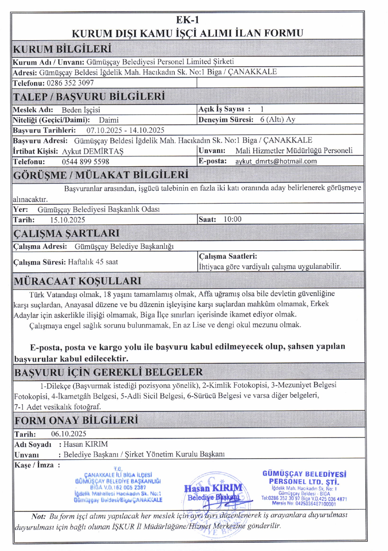 Çanakkale Gümüşçay Belediyesi 1 İşçi Alacak. Son başvuru tarihi 14 Ekim 2025