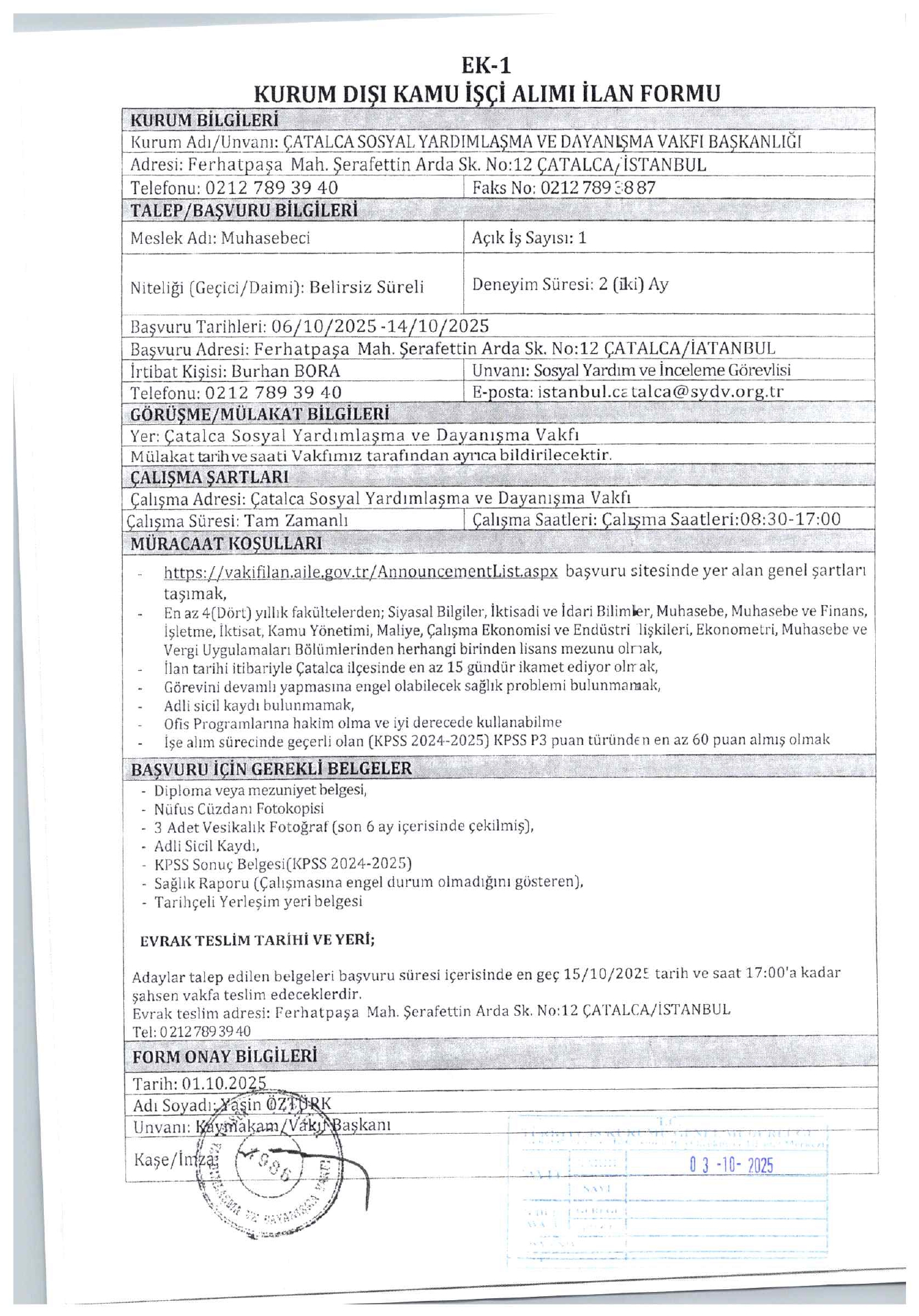 İstanbul Çatalca SYDV Geçici 2 İşçi Alacak. Son başvuru tarihi 14 Ekim 2025