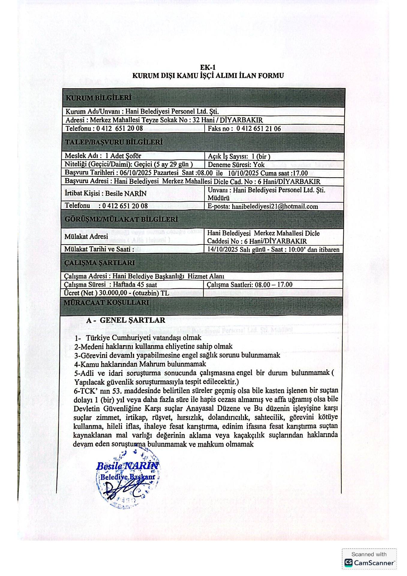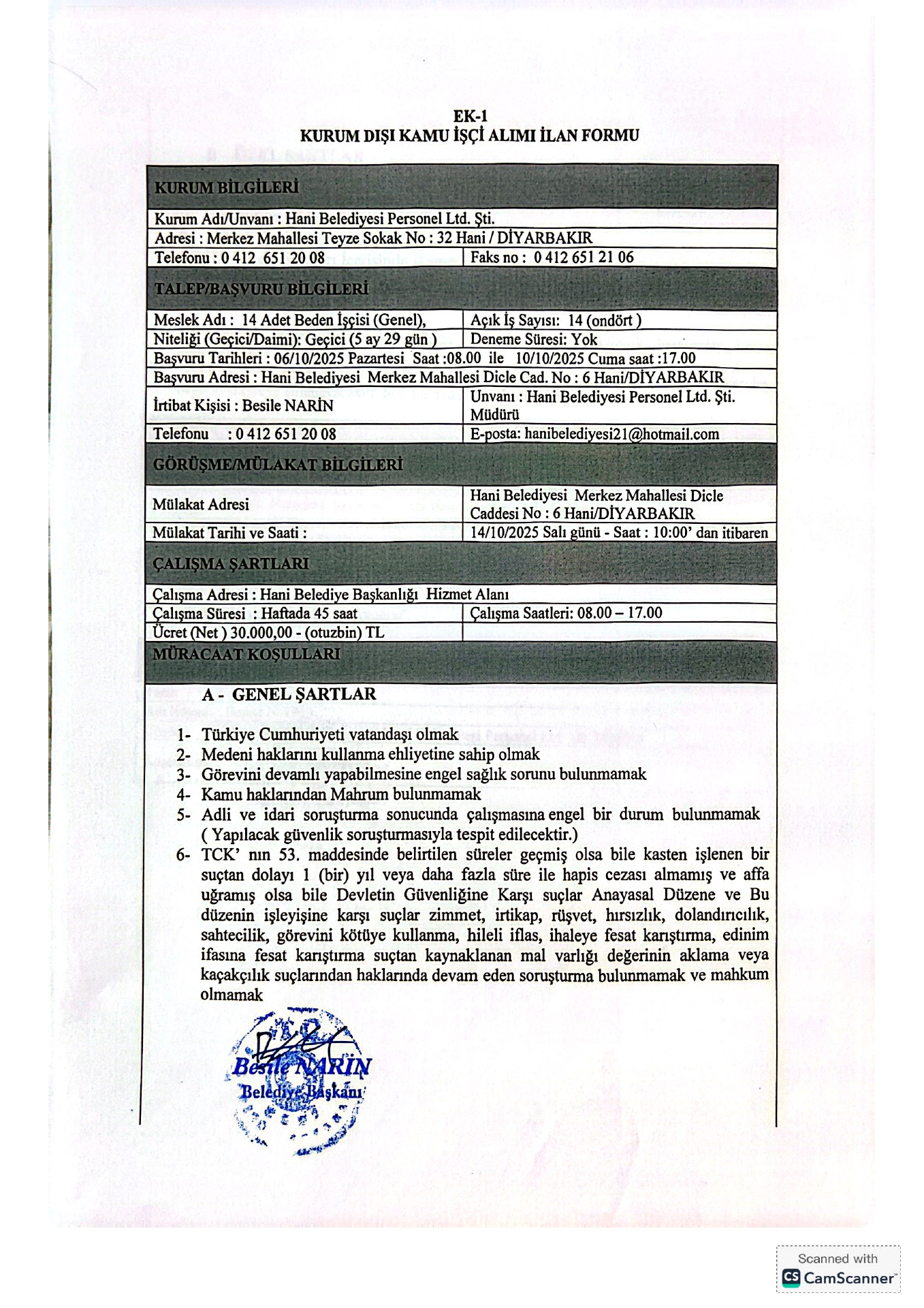 Diyarbakır Hani Belediyesi Geçici 15 İşçi Alacak. Son başvuru tarihi 10 Ekim 2025