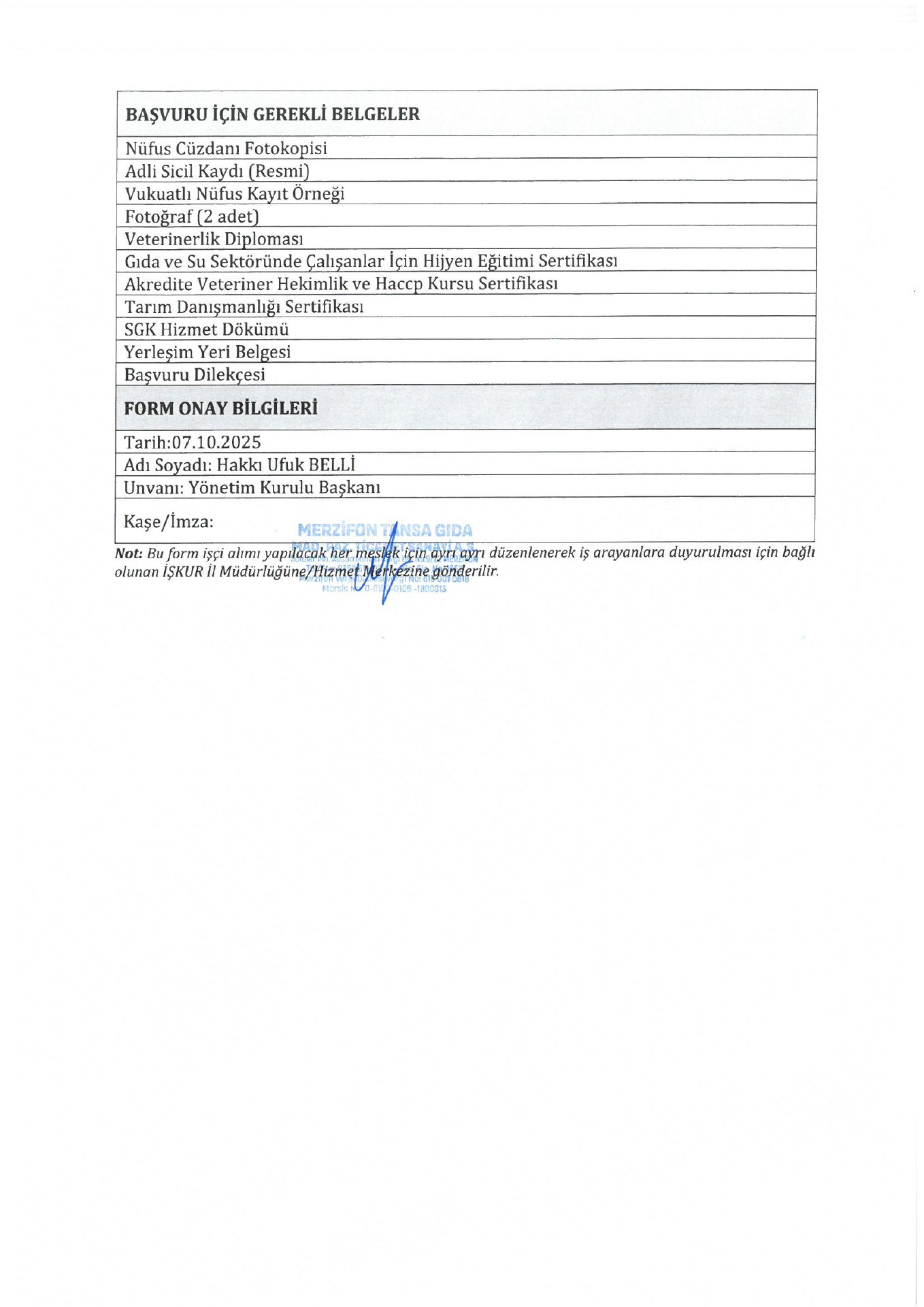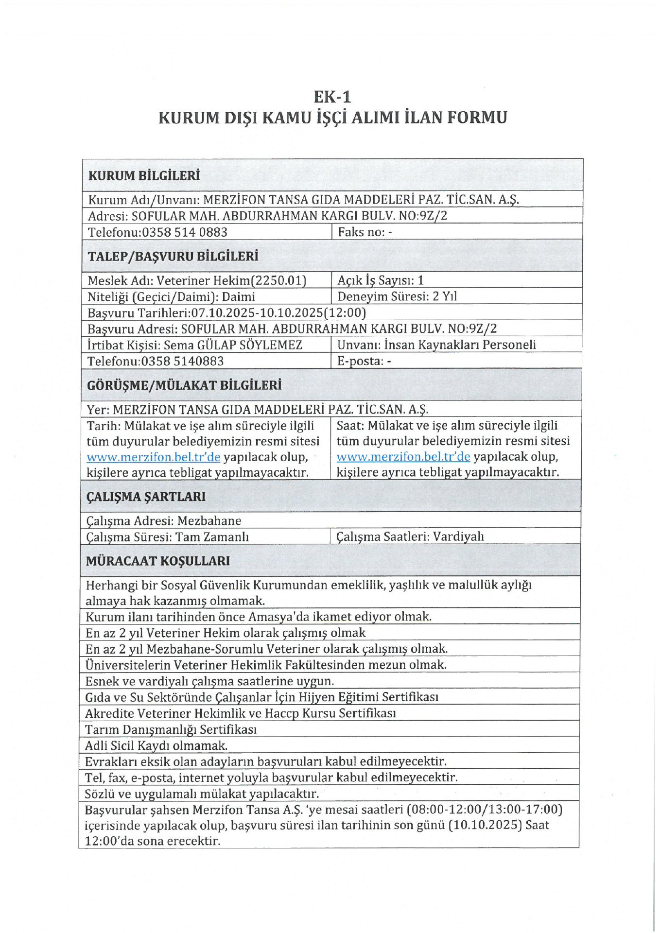 Merzifon Tansa Gıda 1 İşçi Alacak. Son başvuru tarihi 10 Ekim 2025