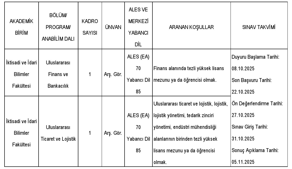 Üniversitemize 2547 sayılı Yükseköğretim Kanununu ve Öğretim Üyesi Dışındaki Öğretim Elemanı Kadrolarına Yapılacak Atamalarda Uygulanacak Merkezi Sınav ile Giriş Sınavlarına İlişkin Usul ve Esaslar Hakkında Yönetmelik uyarınca aşağıda belirtilen kadrolara tam gün statüde çalışacak öğretim elemanları alınacaktır. Başvurular bu ilanın aşağıda belirtilen son başvuru tarihine kadar istenen belgelerle birlikte Çağ Üniversitesi İnsan Kaynakları Direktörlüğüne şahsen veya posta aracılığı ile yapılabilir. Postadaki gecikmeler ve eksik belge ile