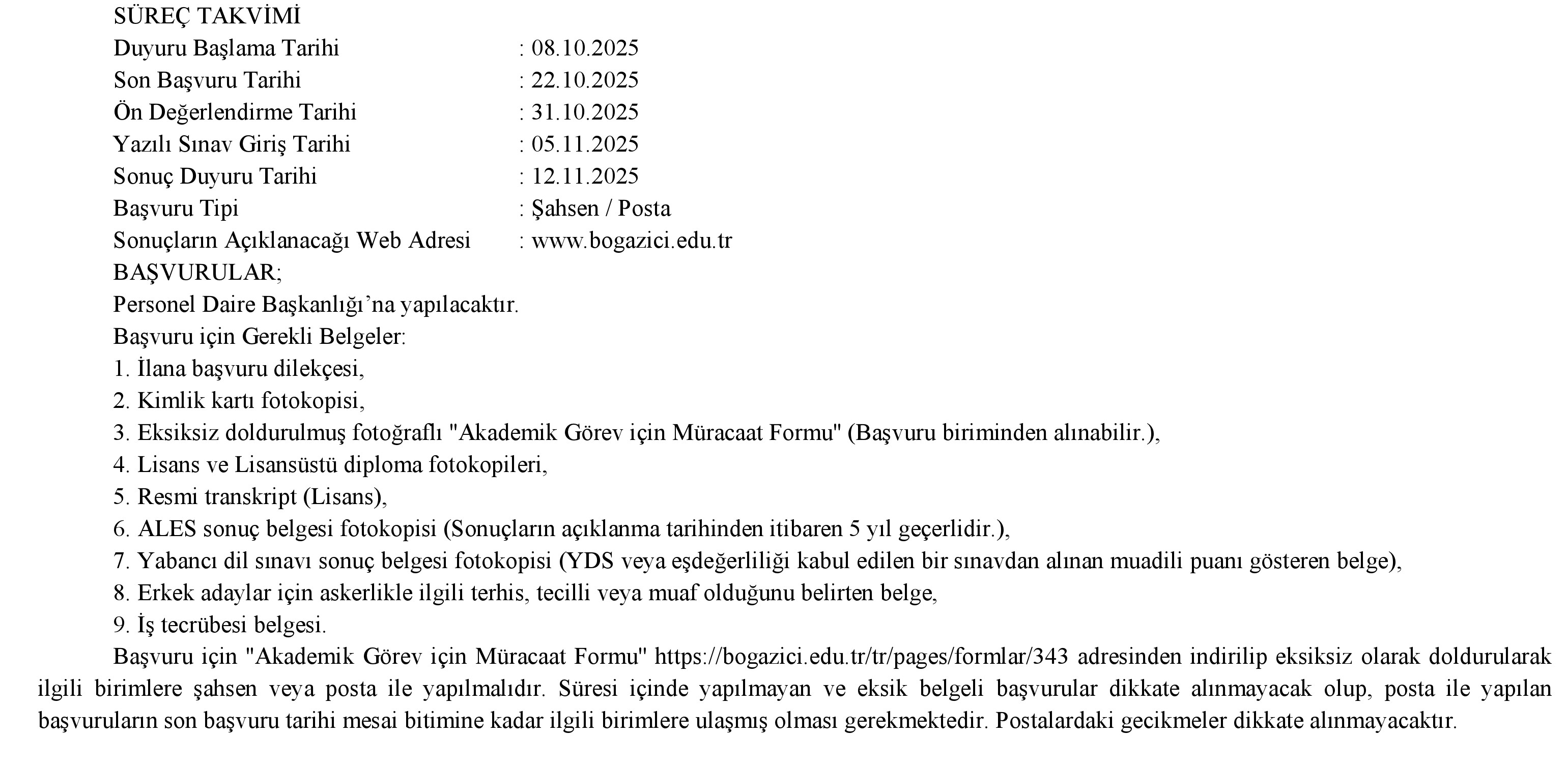 Boğaziçi Üniversitesi öğretim elemanı alacak. Son başvuru tarihi 22 Ekim 2025