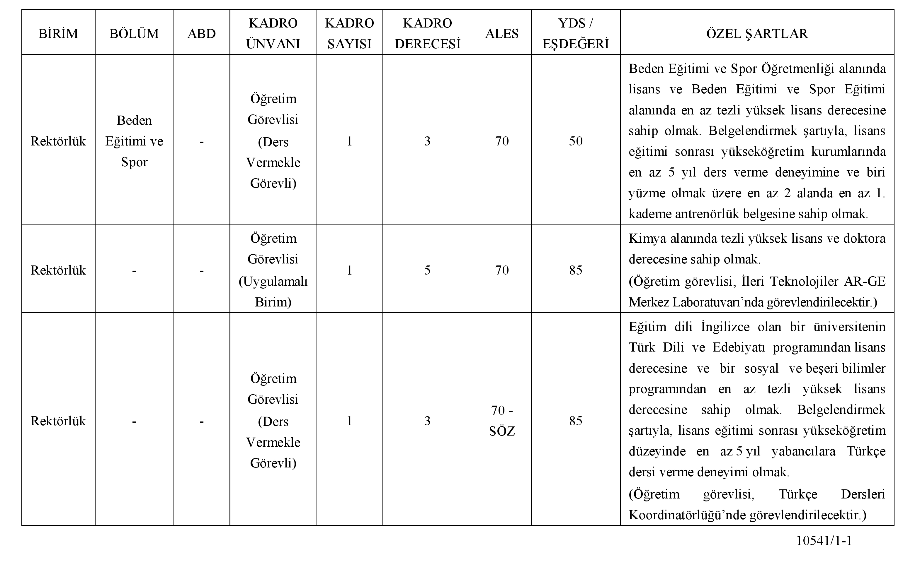 Üniversitemize 2547 sayılı Yükseköğretim Kanunu, 657 sayılı Devlet Memurları Kanunu'nun 48. maddesinde belirtilen genel şartlar, 10/07/2018 tarihli ve 30474 sayılı Resmi Gazete'de yayımlanan Genel Kadro ve Usulü Hakkında 2 Sayılı Cumhurbaşkanlığı Kararnamesi, 09/11/2018 tarihli ve 30590 sayılı Resmi Gazete'de yayımlanan "Öğretim Üyesi Dışındaki Öğretim Elemanı Kadrolarına Yapılacak Atamalarda Uygulanacak Merkezi Sınav ile Giriş Sınavlarına İlişkin Usul ve Esaslar Hakkında Yönetmelik"in ilgili maddeleri uyarınca "Öğretim Görevlisi" alınacaktır.
