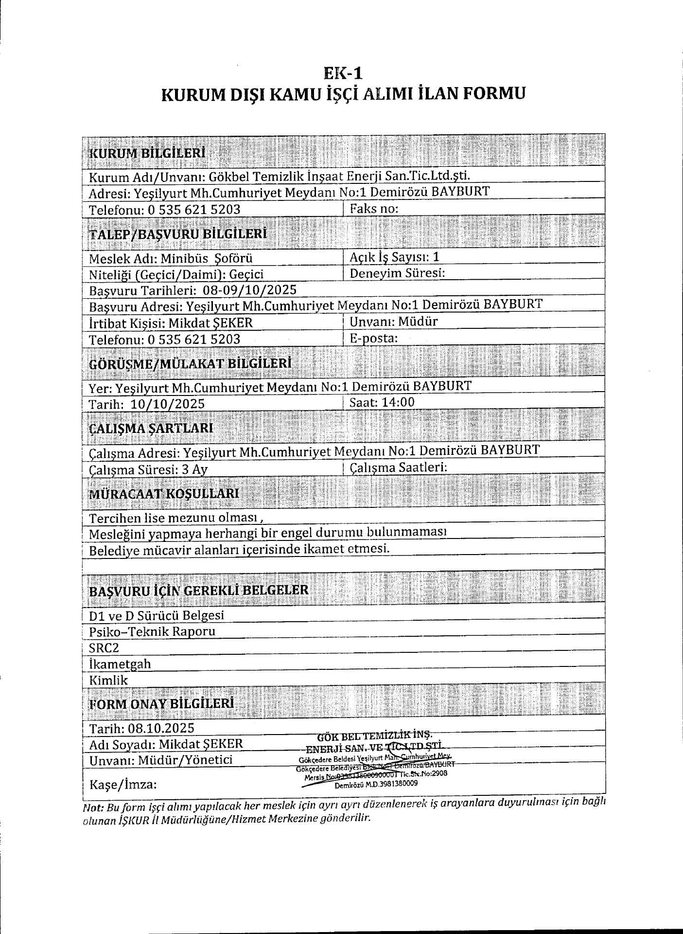Bayburt Gökbel Temizlik Geçici 1 İşçi Alacak. Son başvuru tarihi 10 Ekim 2025