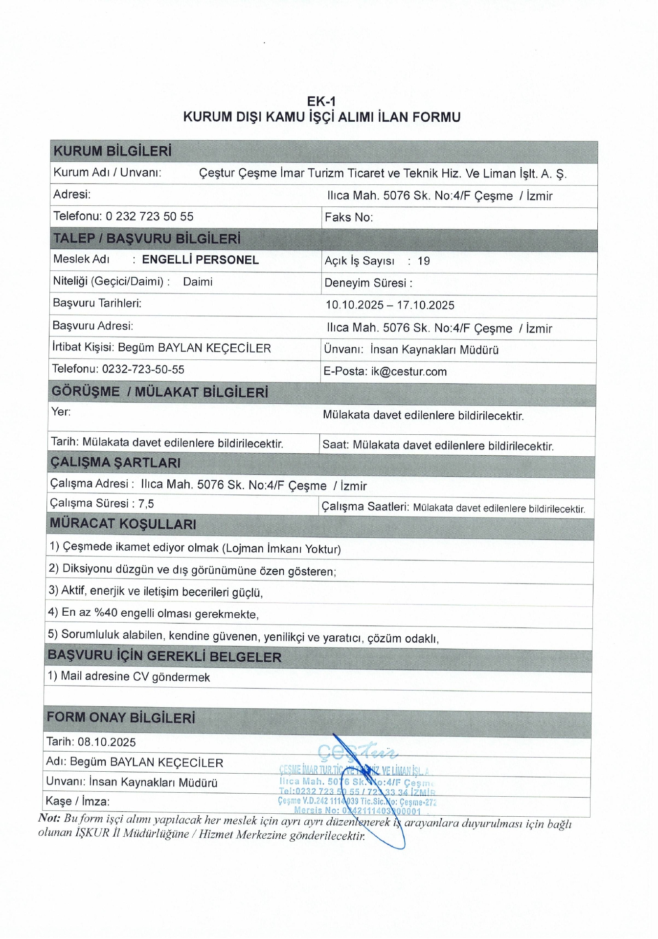 İzmir Çeştur 19 İşçi Alacak. Son başvuru tarihi 17 Ekim 2025