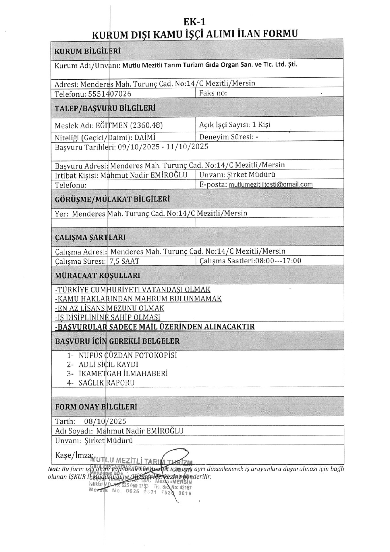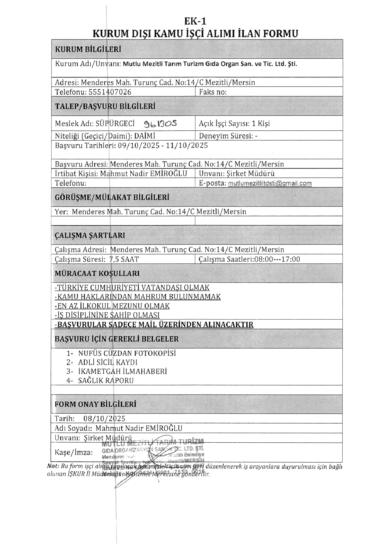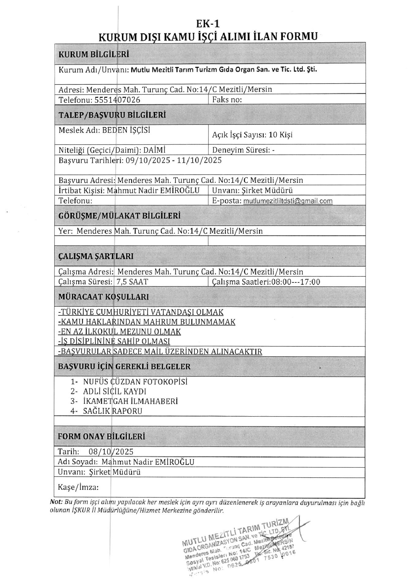 Mersin Mutlu Mezitli Tarım 15 İşçi Alacak. Son başvuru tarihi 11 Ekim 2025