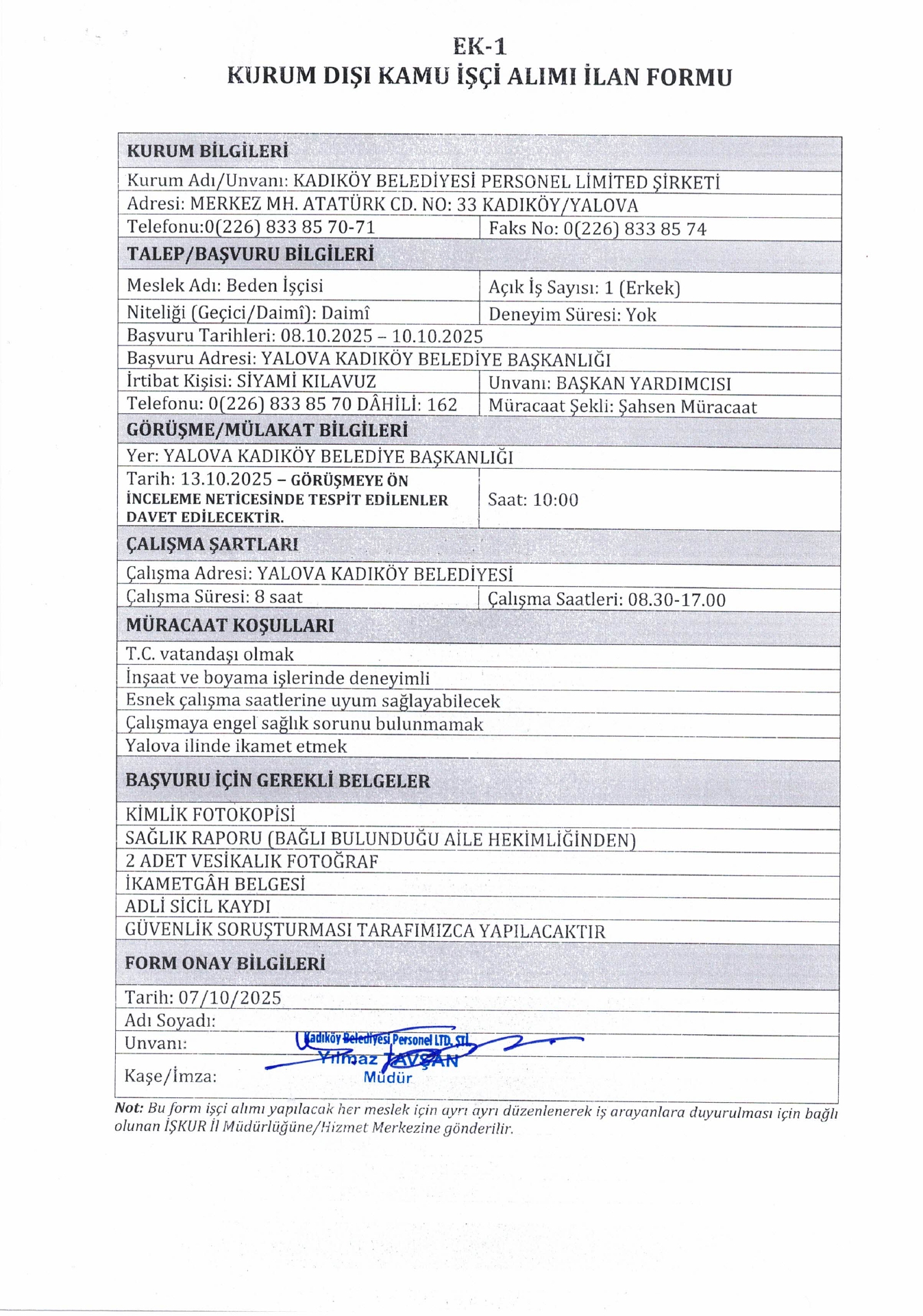 Yalova Kadıköy Belediyesi 1 İşçi Alacak. Son başvuru tarihi 10 Ekim 2025