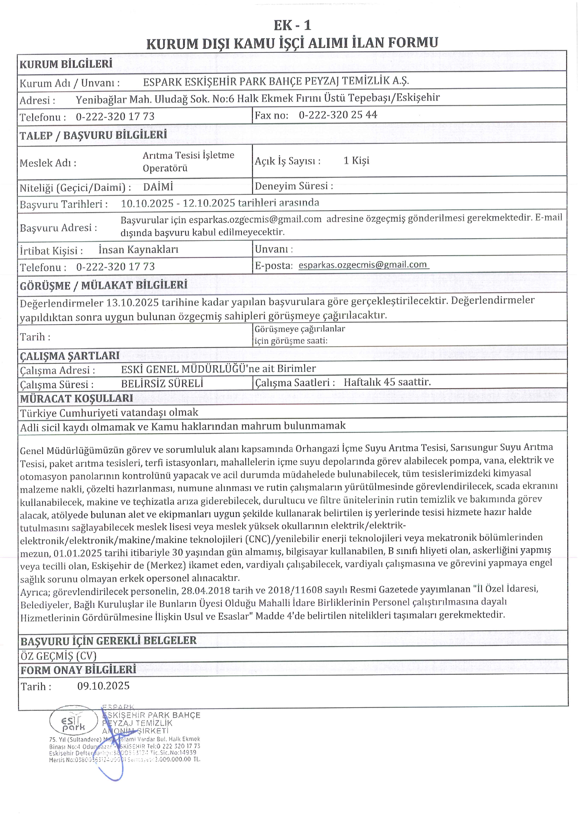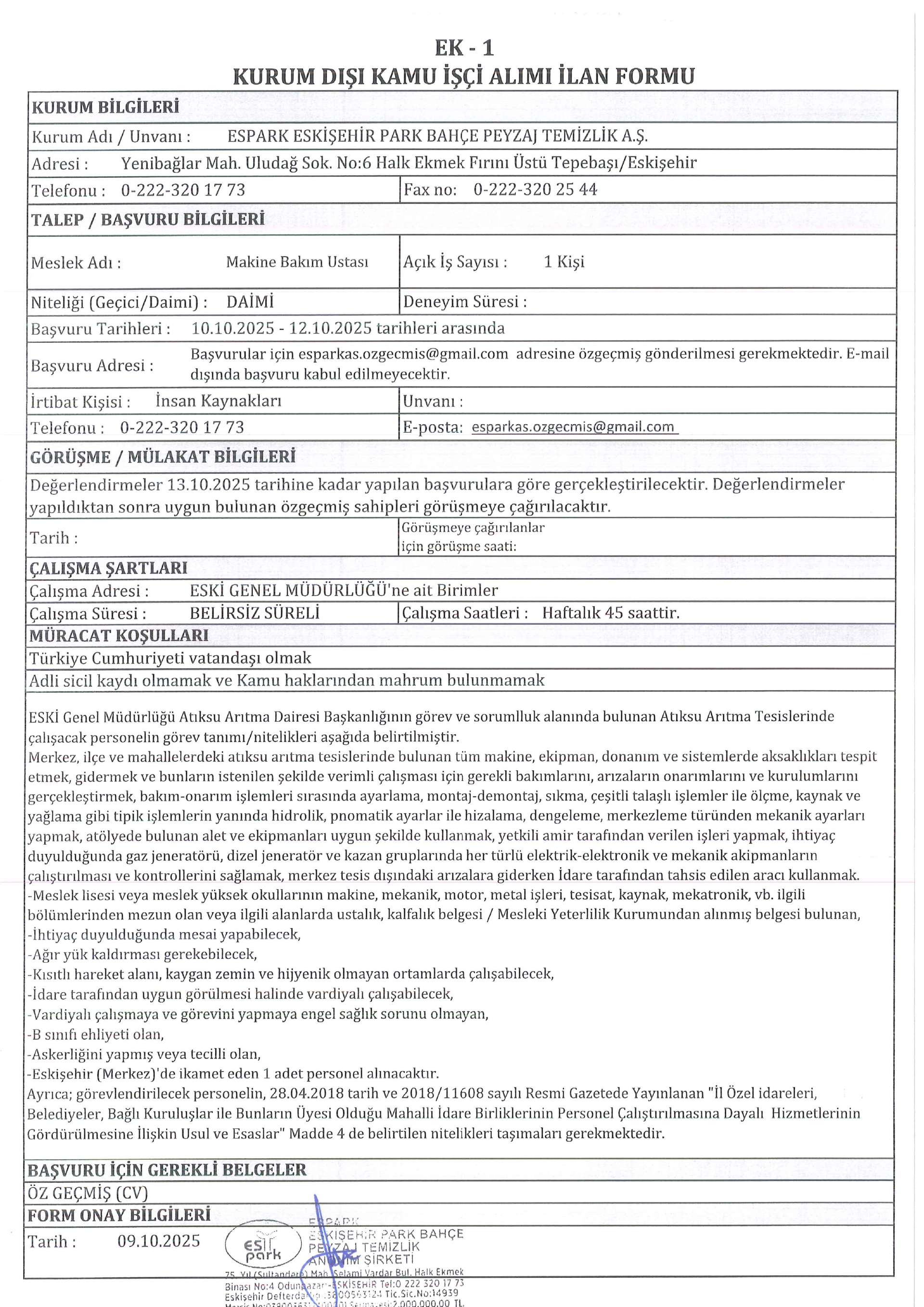 Eskişehir Espark 2 İşçi Alacak. Son başvuru tarihi 12 Ekim 2025