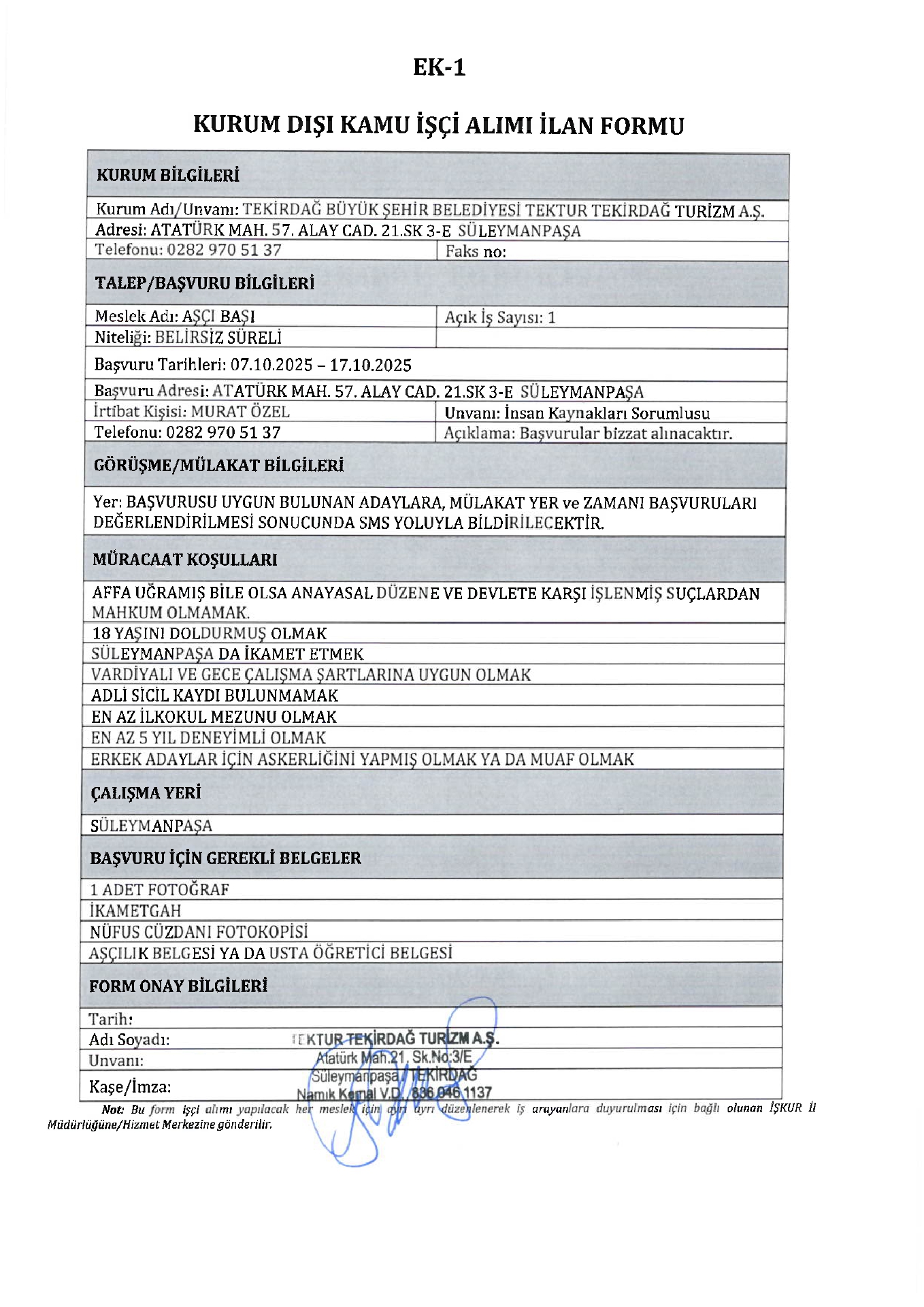 Tekirdağ Tektur 1 İşçi Alacak. Son başvuru tarihi 17 Ekim 2025
