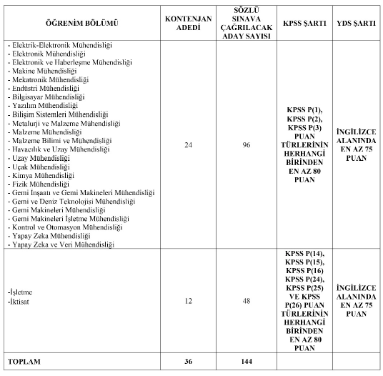 (1) Savunma Sanayii Başkanlığında Genel tdare Hizmetleri sınıfından 7 nci derece kadrolara atanmak üzere, Giriş Sınavı (Sözlü Sınav Yöntemi) ile aşağıda yer alan öğrenim bölümleri ve öğrenim bölümü karşısında belirtilen kontenjan adedi kadar Savunma Sanayii Uzman Yardımcısı alınacaktır: