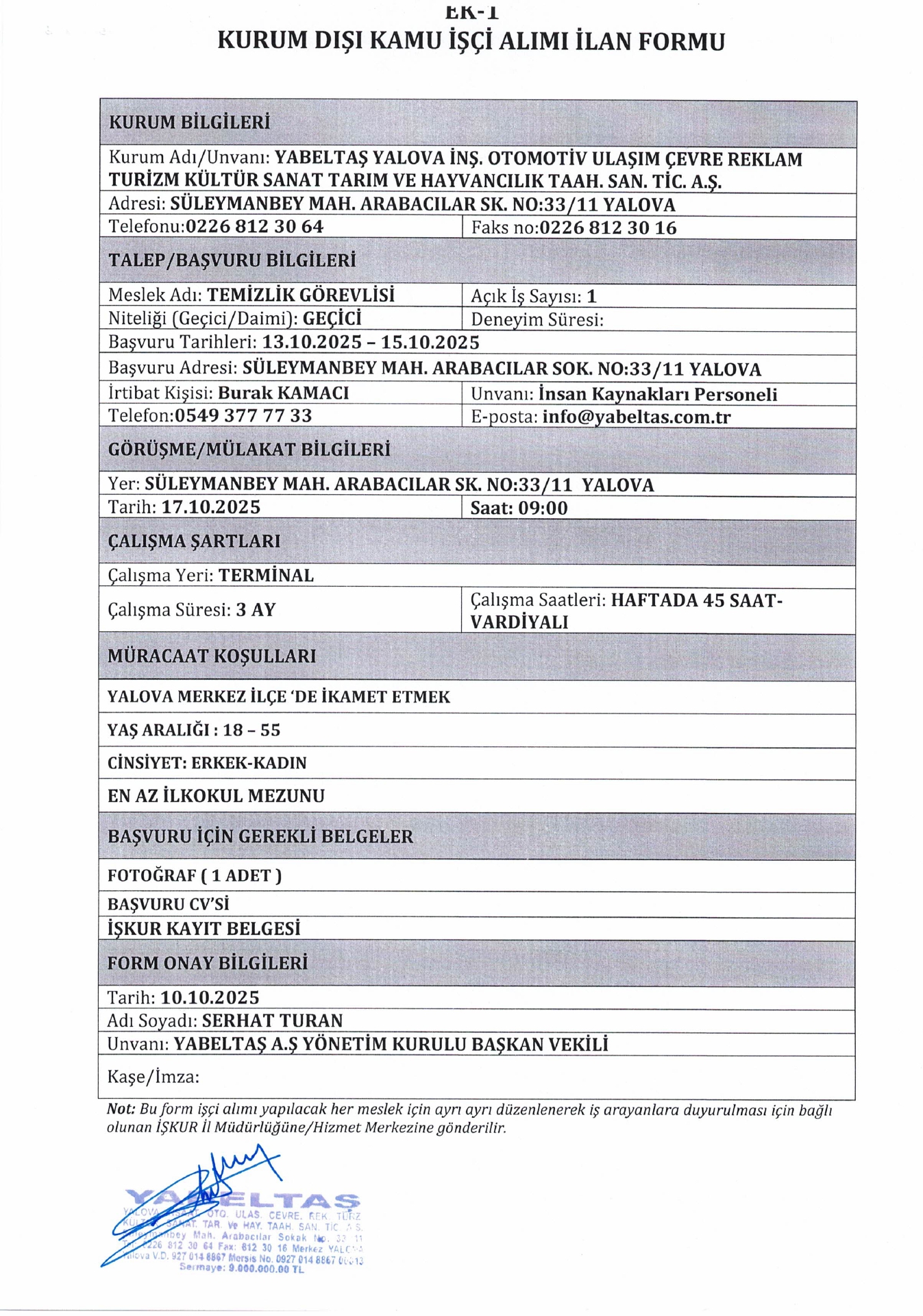 Yalova Yebeltaş Geçici 1 İşçi Alacak. Son başvuru tarihi 15 Ekim 2025