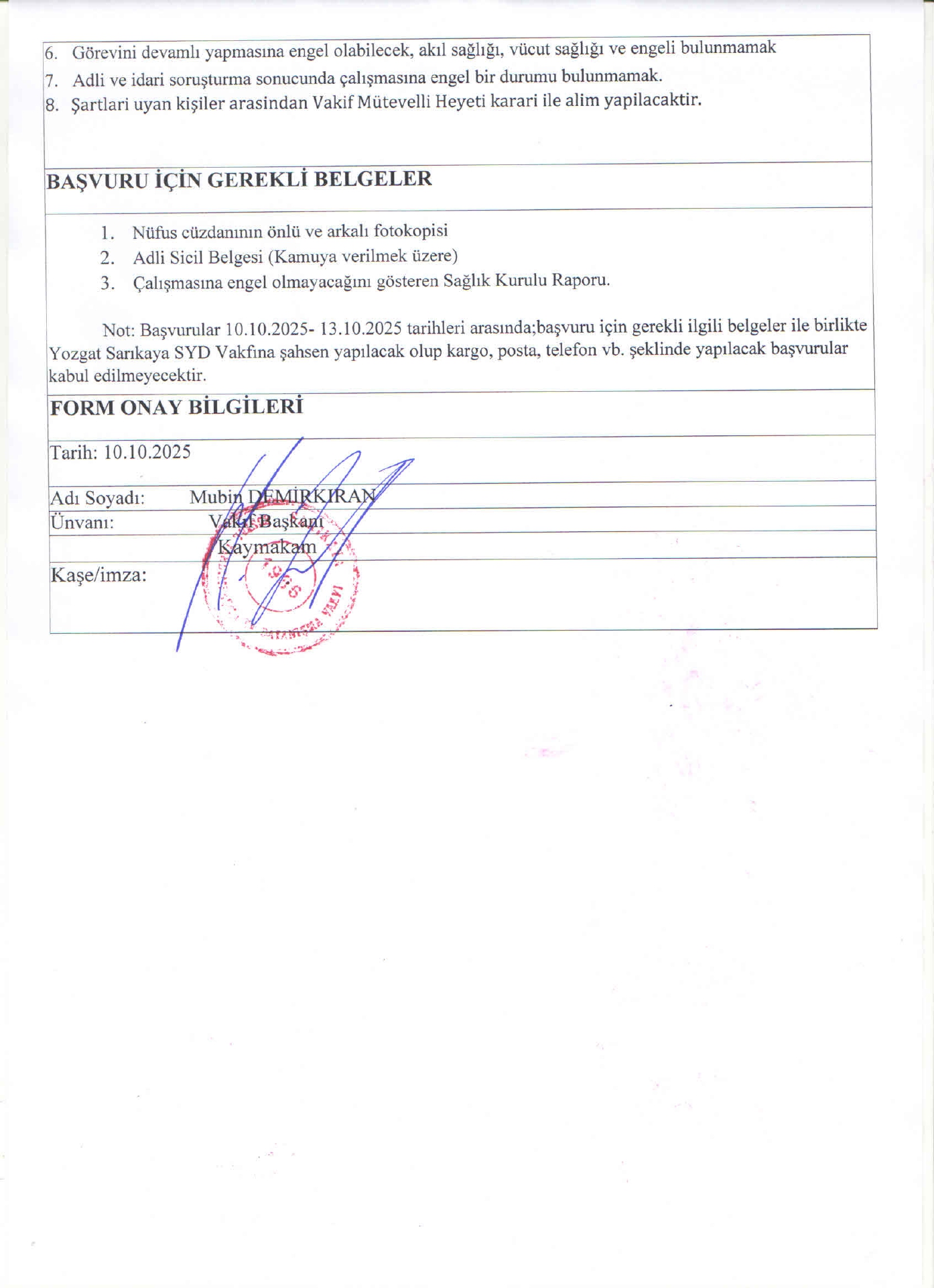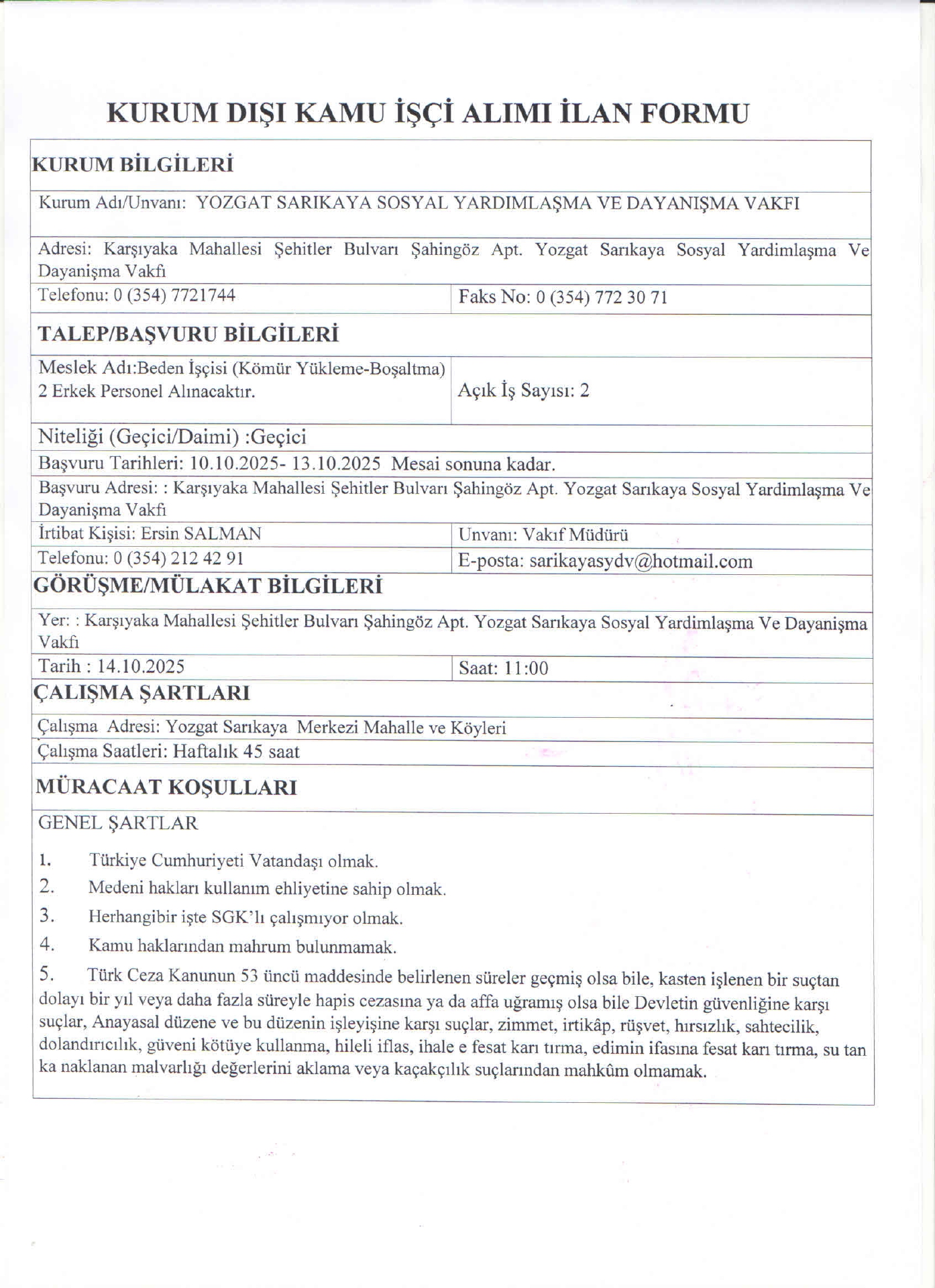 Yozgat Sarıkaya SYDV Geçici 2 İşçi Alacak. Son başvuru tarihi 13 Ekim 2025