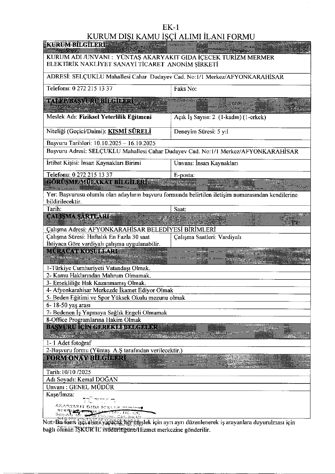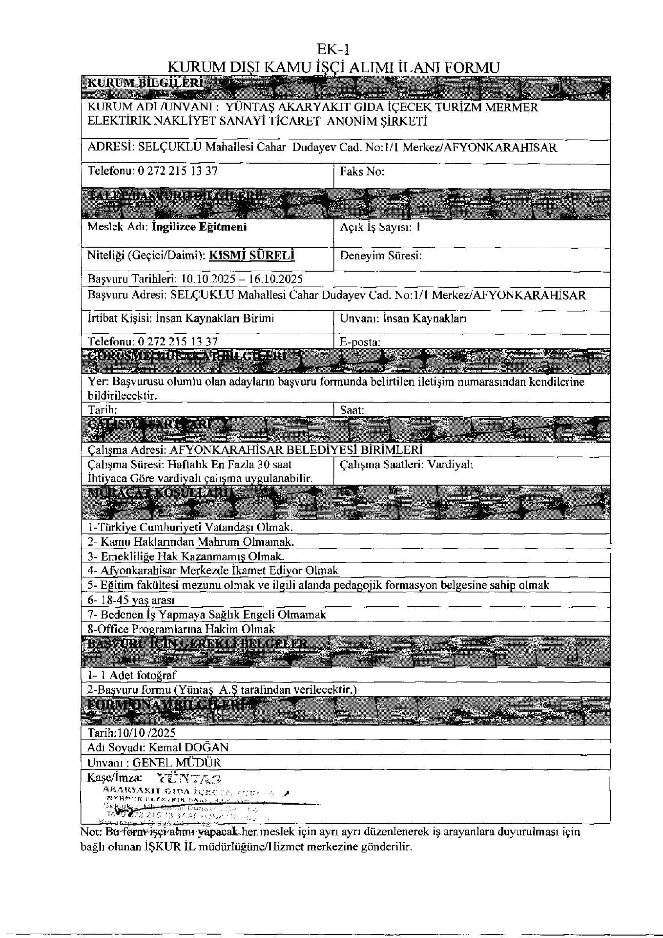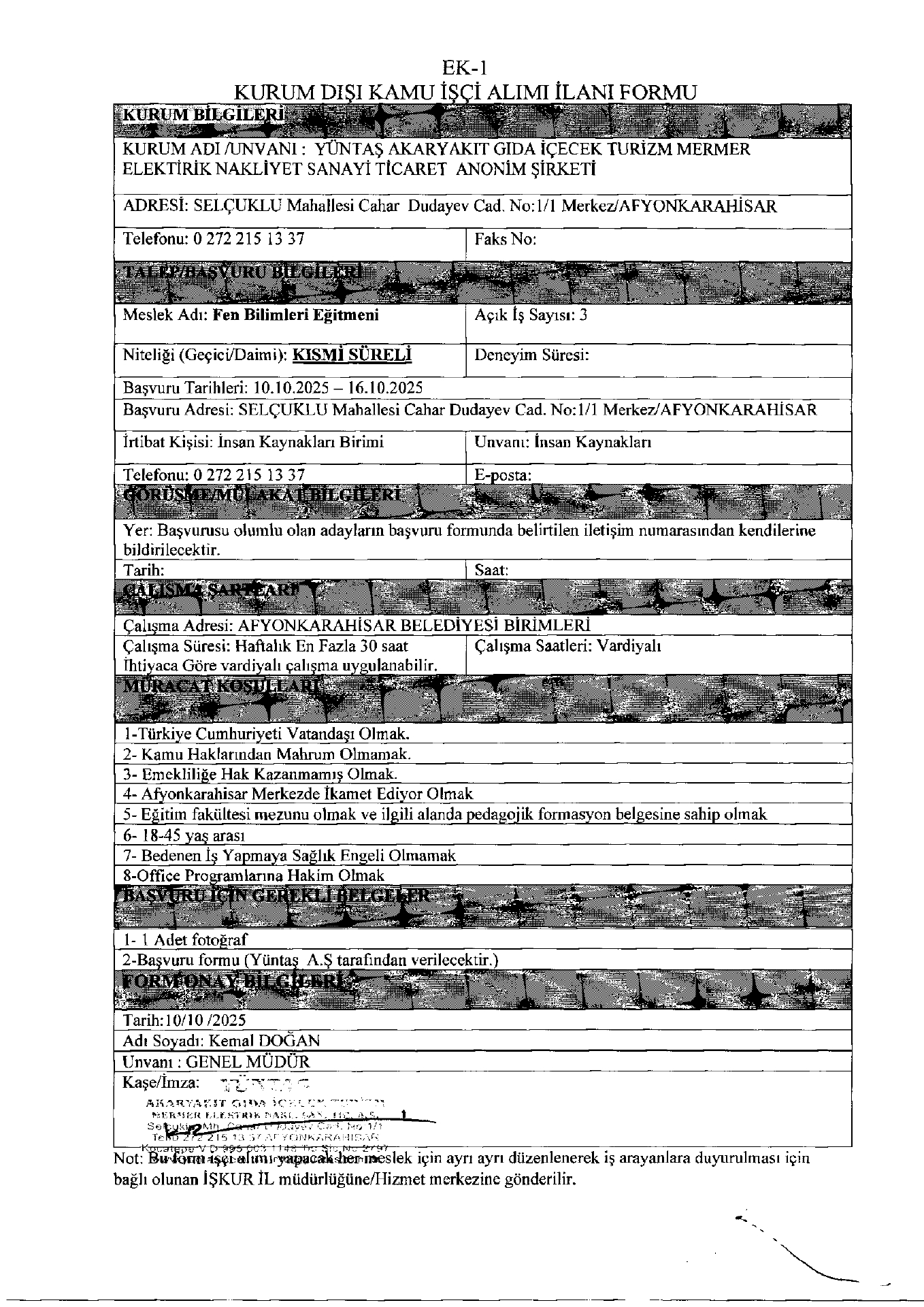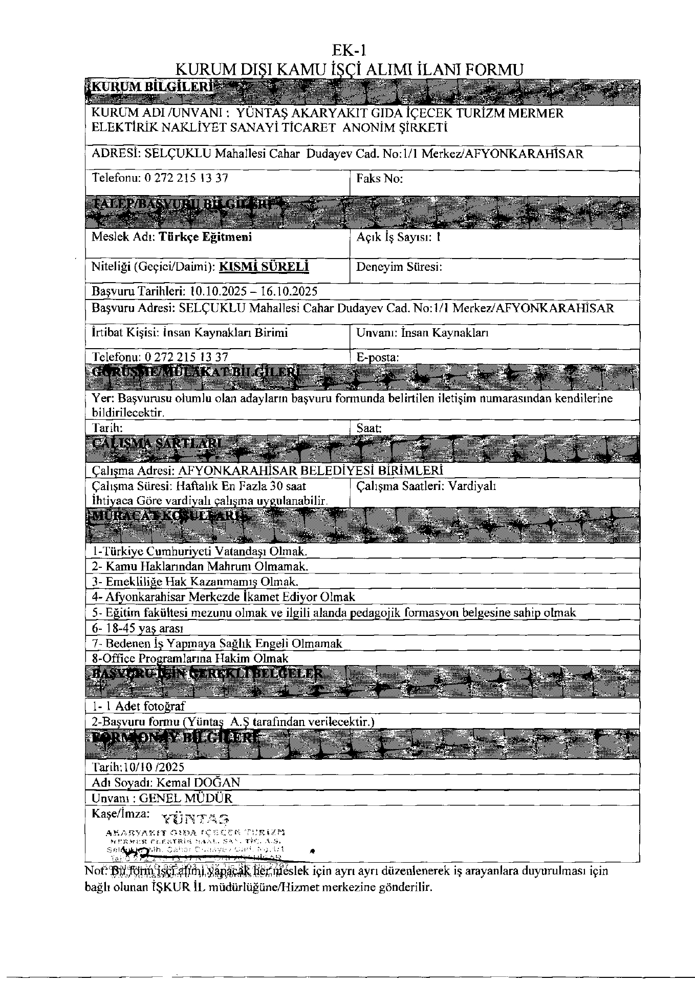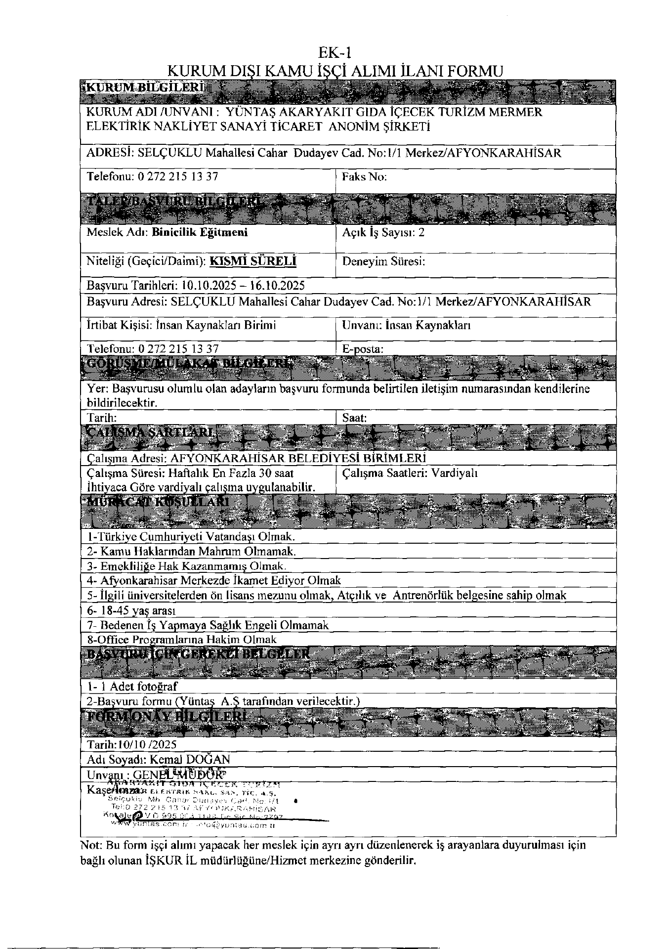 Afyonkarahisar Yüntaş Akaryakıt 25 İşçi Alacak. Son başvuru tarihi 16 Ekim 2025