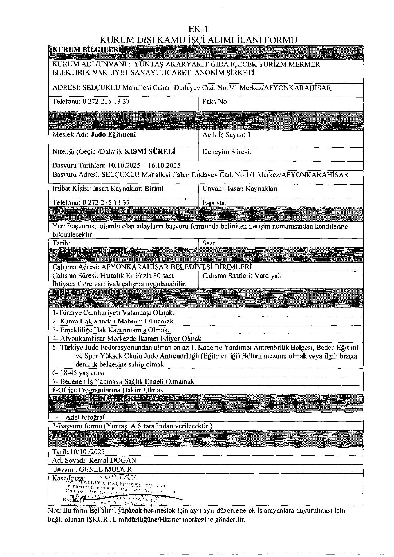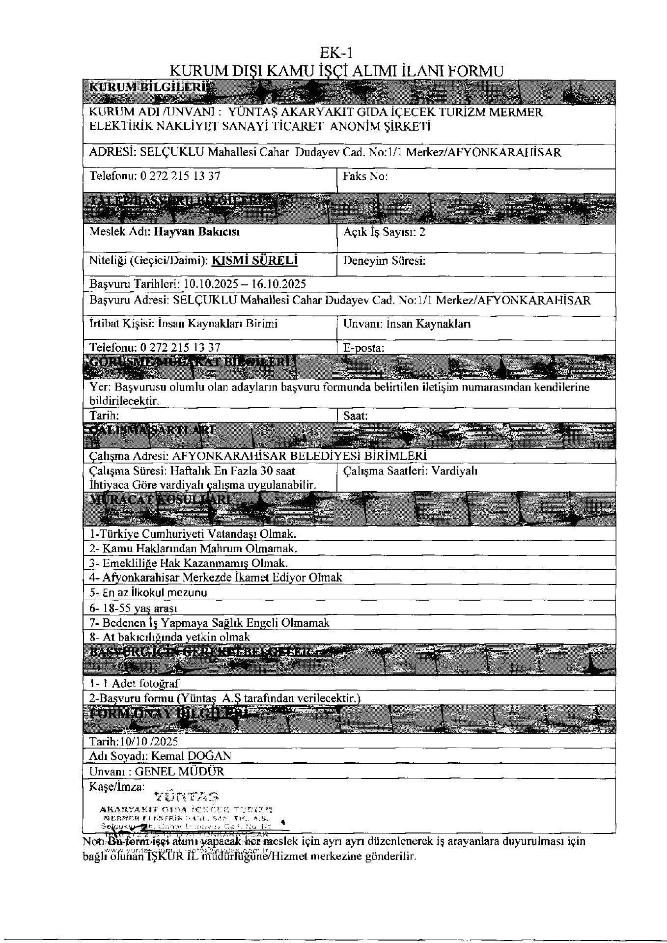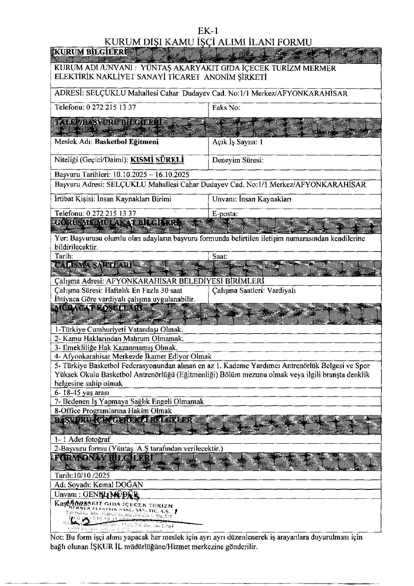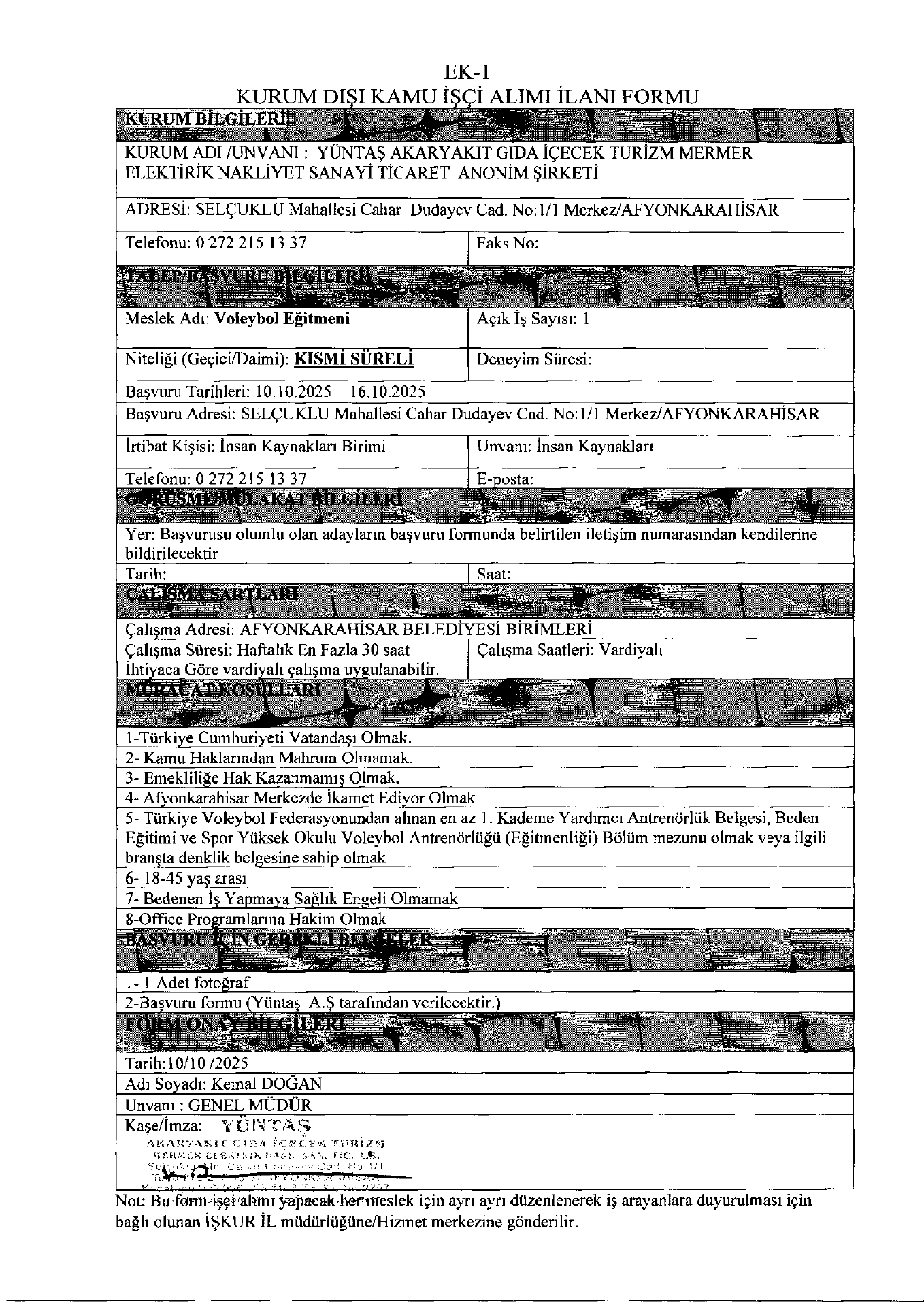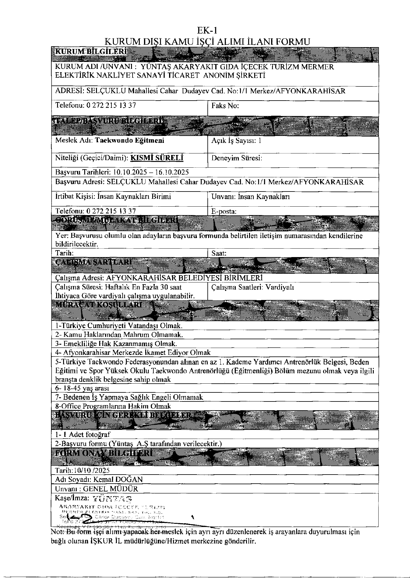 Afyonkarahisar Yüntaş Akaryakıt 25 İşçi Alacak. Son başvuru tarihi 16 Ekim 2025