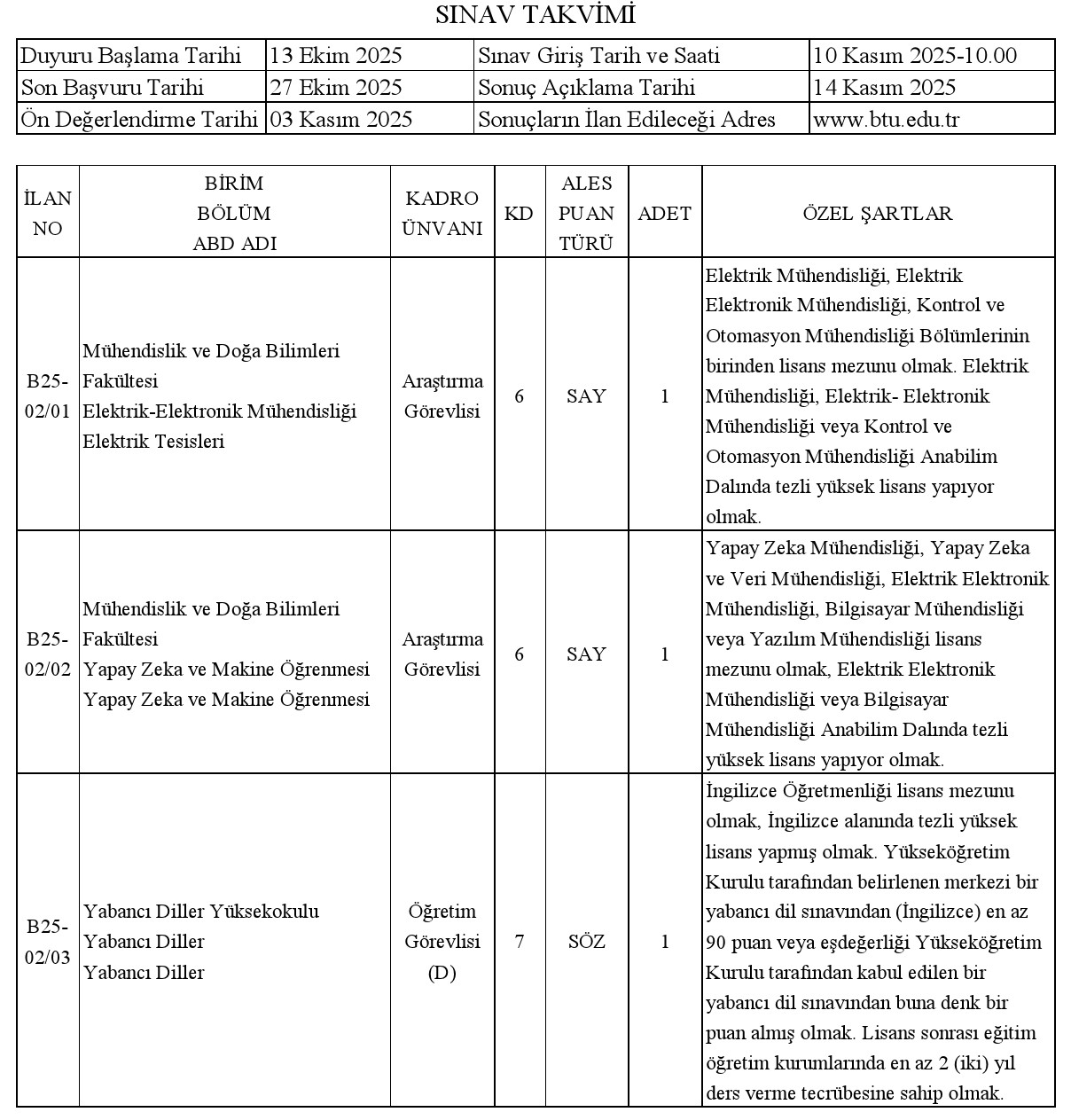 Üniversitemiz birimlerine 657 sayılı Kanunun 48 inci, 2547 sayılı Kanunun 31 ve 50/d maddesi ile "Öğretim Üyesi Dışındaki Öğretim Elemanı Kadrolarına Yapılacak Atamalarda Uygulanacak Merkezi Sınav İle Giriş Sınavlarına İlişkin Usul ve Esaslar Hakkındaki Yönetmeliğin ilgili hükümleri uyarınca Araştırma Görevlisi ve Öğretim Görevlisi alınacaktır. Başvurular https://basvuru.btu.edu.tr adresinden yapılacak olup şahsen ya da posta yoluyla başvurular kabul edilmeyecektir. Başvuracak adayların ilgili mevzuatta ve ilanda belirtilen şartları taşımaları gerekmektedir. İlanda belirtilen bilgiler kadro ilanına başvurmak için asgari koşul olup kadroya atanma hakkını sağlamaz.