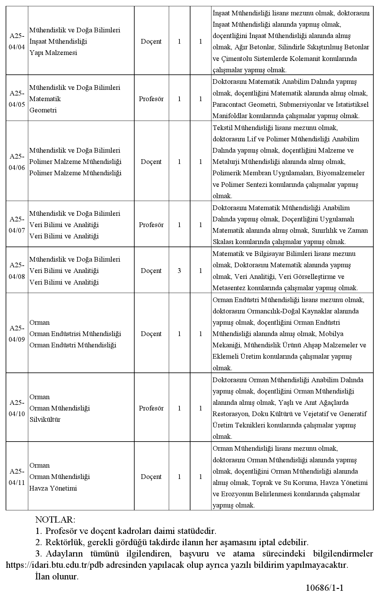 Üniversitemizin aşağıda belirtilen birimlerine, 657 sayılı Devlet Memurları Kanunu'nun 48. Maddesi, 2547 ve 2914 sayılı Kanun ve bu kanunlara dayalı olarak çıkarılan ilgili yönetmelik hükümleri ile "Bursa Teknik Üniversitesi Öğretim Üyeliğine Yükseltilme ve Atanma Yönergesi" doğrultusunda Öğretim Üyesi alınacaktır. Başvuru süresi ilanın Resmi Gazete'de yayımlandığı tarih itibariyle başlar 15 inci günün mesai saati bitiminde sona erer. Başvurular https://basvuru.btu.edu.tr adresinden yapılacak olup şahsen ya da posta yoluyla yapılacak başvurular kabul edilmeyecektir.