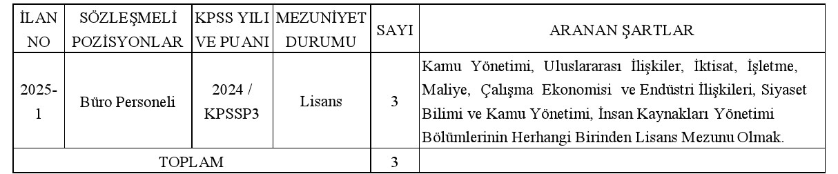 657 sayılı Devlet Memurları Kanunu'nun 4. maddesinin (B) fıkrasına 06.06.1978 tarihli ve 7/15754 sayılı Kararnameye ekli 28.06.2007 tarih ve 26566 sayılı Resmi Gazete'de yayımlanan "Sözleşmeli Personel Çalıştırılmasına İlişkin Esaslarda Değişiklik Yapılmasına Dair Esaslar" da yer alan ek 2'nci maddenin (b) fıkrasına göre KPSS (B) grubu puan sırası esas alınmak suretiyle aşağıda belirtilen pozisyona toplam 3 (üç) adet sözleşmeli personel alınacaktır.