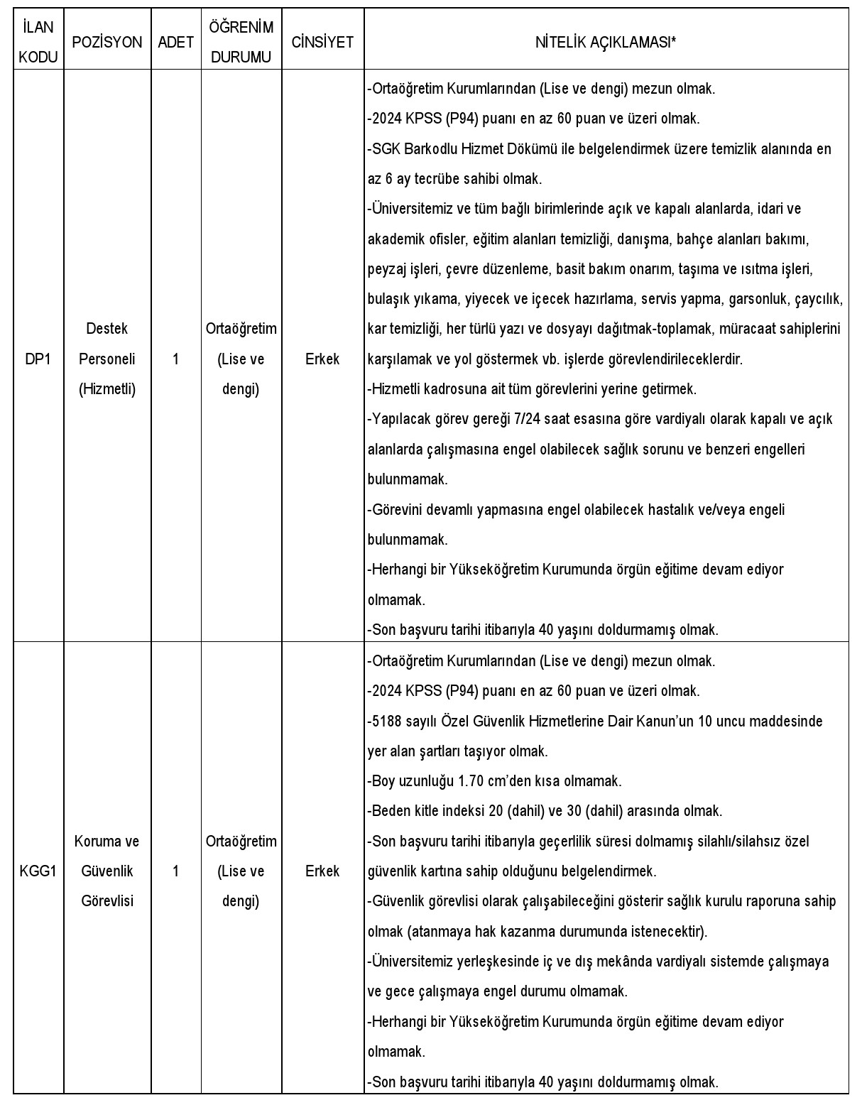 657 sayılı Devlet Memurları Kanunu'nun değişik 4'üncü maddesinin (B) fıkrası uyarınca istihdam edilmek üzere, 06/06/1978 tarihli ve 7/15754 sayılı Bakanlar Kurulu Kararı ile yürürlüğe konulan "Sözleşmeli Personel Çalıştırılmasına İlişkin Esaslar" da yer alan Ek 2'nci maddesinin (b) fıkrası gereğince yazılı ve/veya sözlü sınav yapılmaksızın, 2024 KPSS (B) grubu puan sıralaması esas alınmak suretiyle aşağıda belirtilen pozisyonlara toplam 2 (İki) adet sözleşmeli personel alınacaktır.
