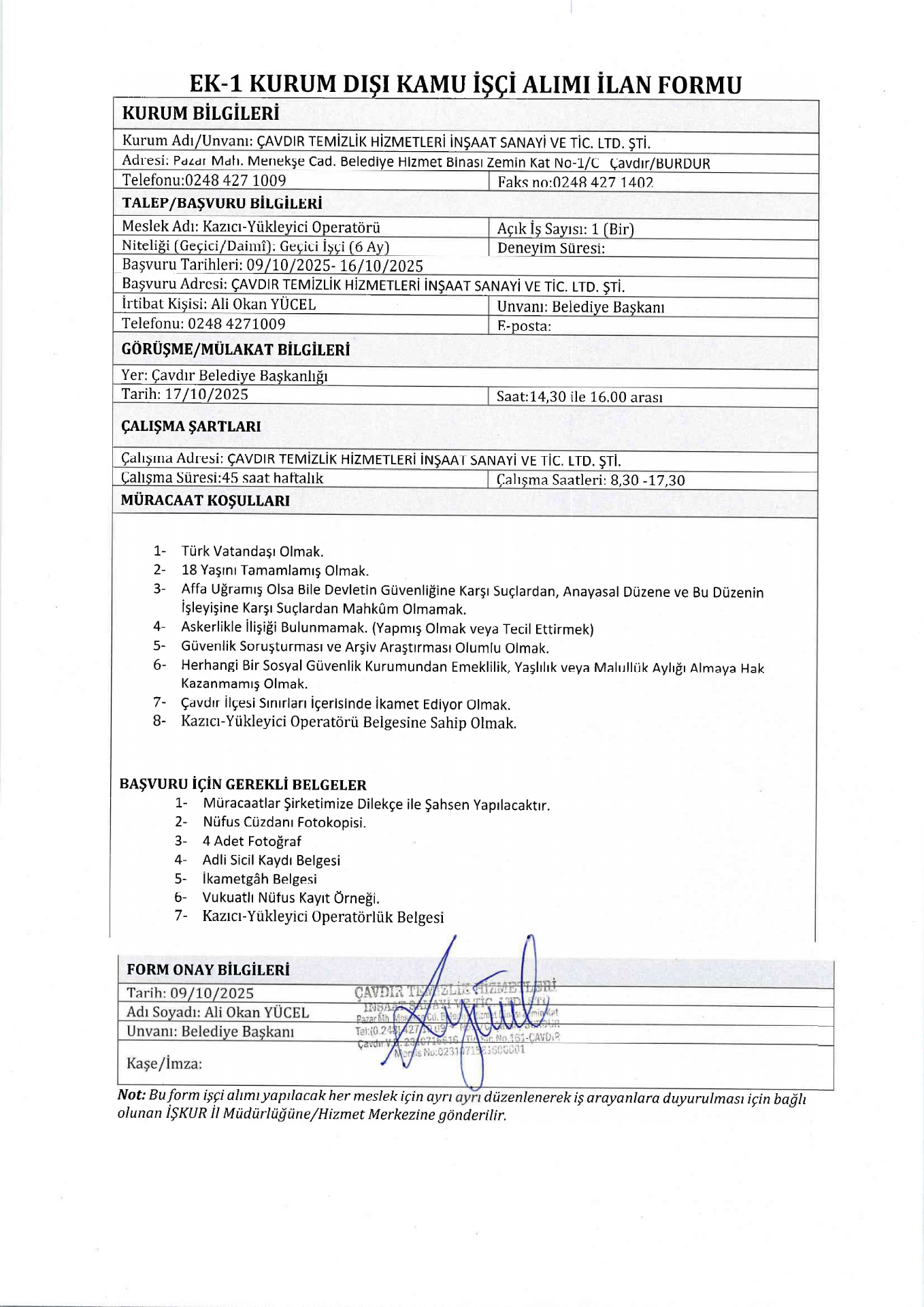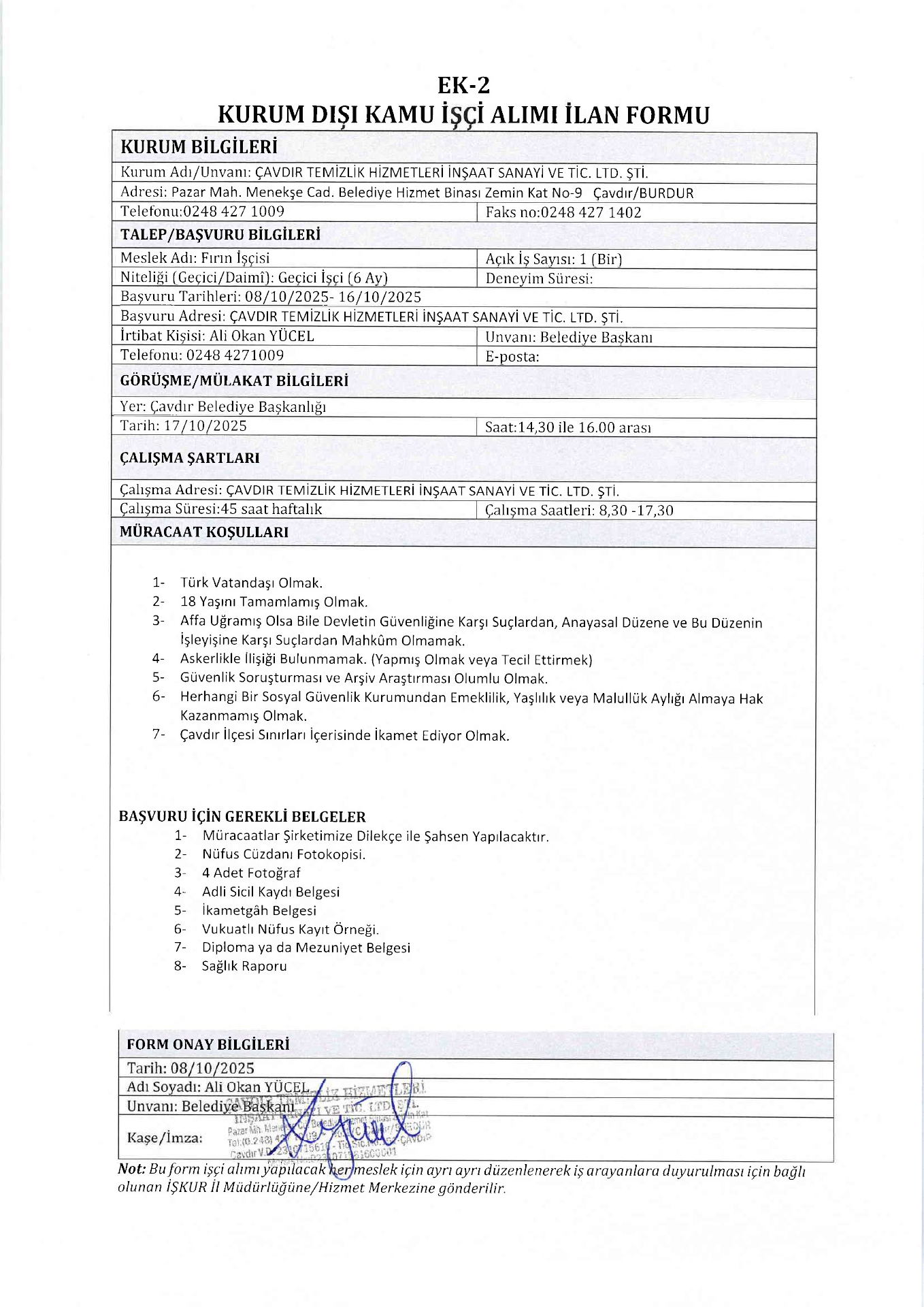 Ana sayfaGeçici İşçi İlanları Burdur Çavdır Temizlik Geçici 3 İşçi Alacak Burdur Çavdır Temizlik Geçici 3 İşçi Alacak. Son başvuru tarihi 16 Ekim 2025 Kaynak : İşkur İlan Giriş : 13 Ekim 2025 22:38, Son Güncelleme : 13 Ekim 2025 23:25 Yazdır Yorumlar (0) Abone Ol