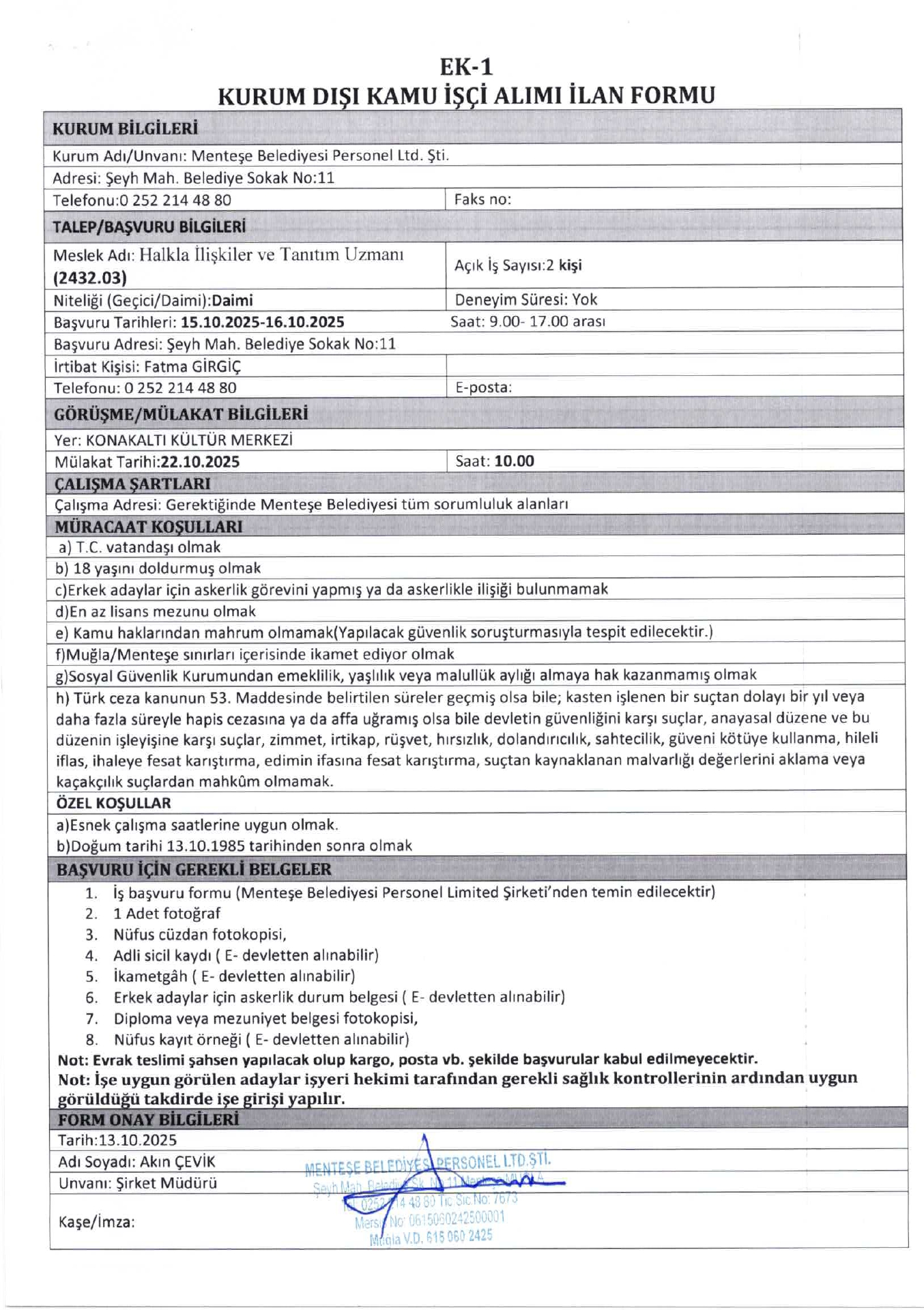 Ana sayfaDaimi İşçi İlanları Muğla Menteşe Belediyesi 2 İşçi Alacak Muğla Menteşe Belediyesi 2 İşçi Alacak. Son başvuru tarihi 16 Ekim 2025 Kaynak : İşkur İlan Giriş : 13 Ekim 2025 23:02, Son Güncelleme : 13 Ekim 2025 23:26 Yazdır Yorumlar (1) Abone Ol